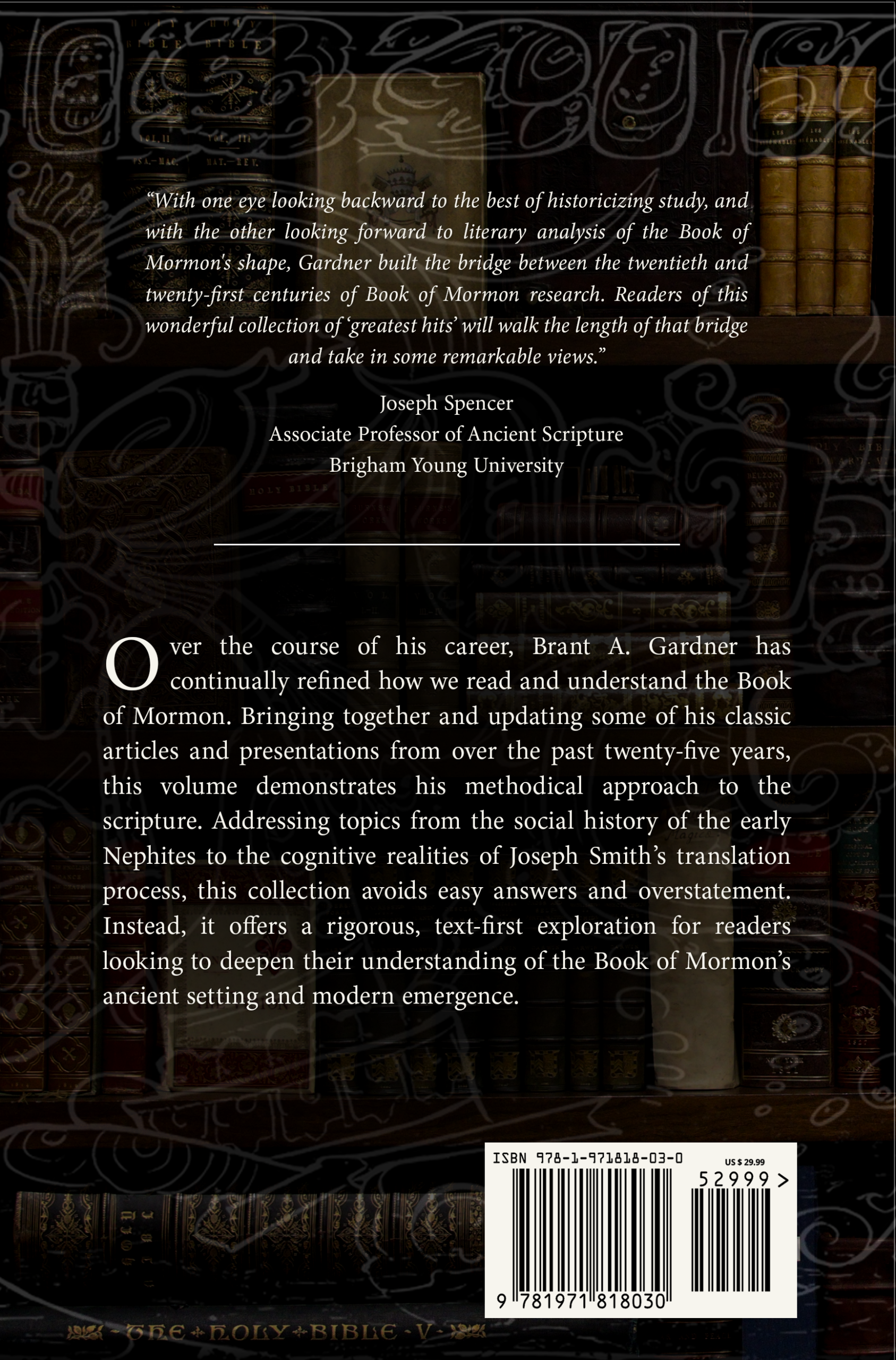 Over the course of his career, Brant A. Gardner has continually refined how we read and understand the Book of Mormon. Bringing together and updating some of his classic articles and presentations from over the past twenty-five years, this volume demonstrates his methodical approach to the scripture. Addressing topics from the social history of the early Nephites to the cognitive realities of Joseph Smith’s translation process, this collection avoids easy answers and overstatement. Instead, it offers a rigorous, text-first exploration for readers looking to deepen their understanding of the Book of Mormon’s ancient setting and modern emergence.