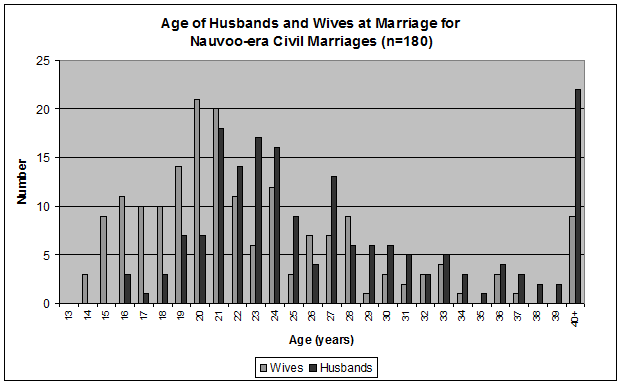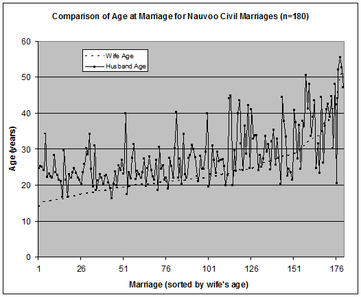 One hundred and eighty Nauvoo-era civil marriages have husbands and wives with known ages and marriage dates. [70] Chart 12 2 demonstrates that these marriages follow the general pattern of wives being younger than husbands.