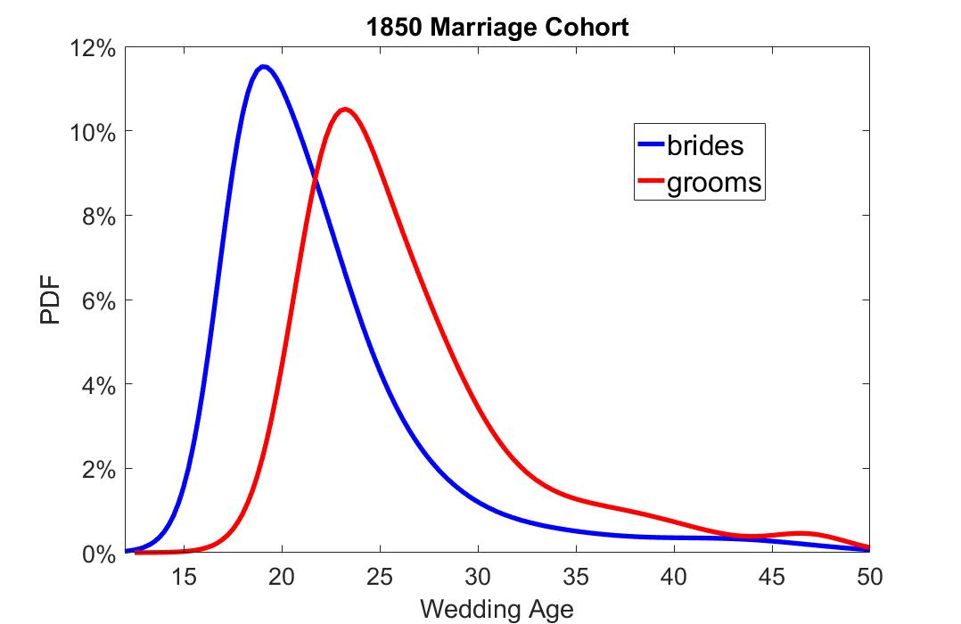 Statistical information for marital ages is available from the 1850 census. [14] Using a 1% random sample of individuals, 989 men and 962 women indicated they had been married within the last year. The plot below breaks these individuals down by census age.