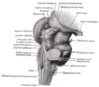 [[Image:mesencephalon_1.gif|thumb|200 px|right|Close-up of mid- and hind-brain; the mid-brain is the area above the pons. From: Henry Gray, ''Anatomy of the Human Body'', 1918, Fig 681. {{link|url=http://www.bartleby.com/107/illus681.html}}.]] | |||