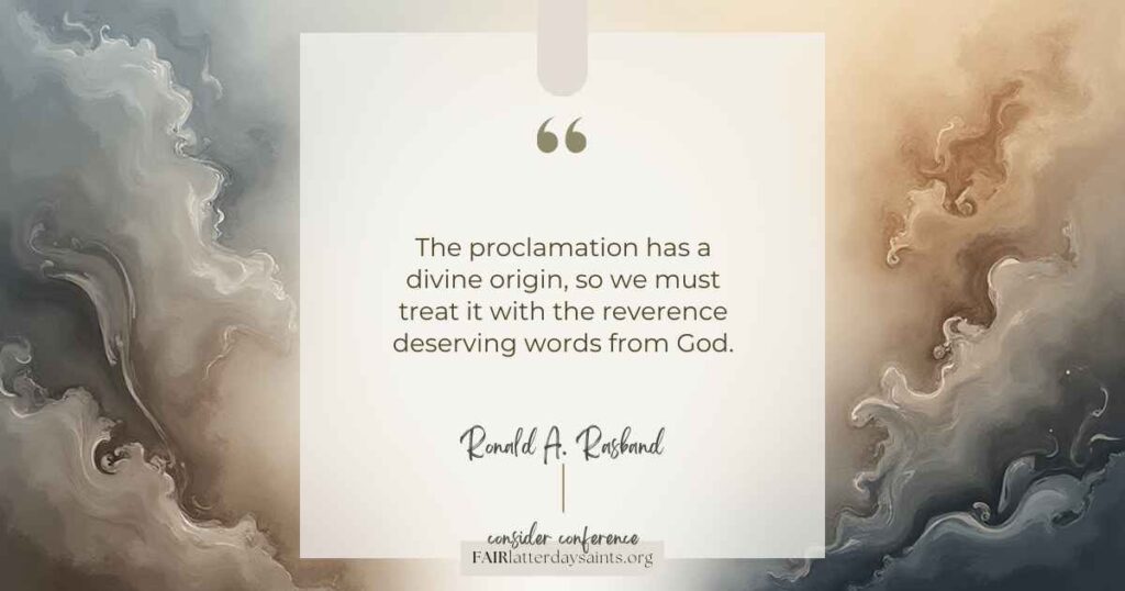 Elder Rasband teaches that the Family Proclamation originated through revelation, prophetic councils, and unity—not as a reaction to social trends, but as guidance given ahead of them. Its authority rests in God’s eternal perspective, not in human approval.