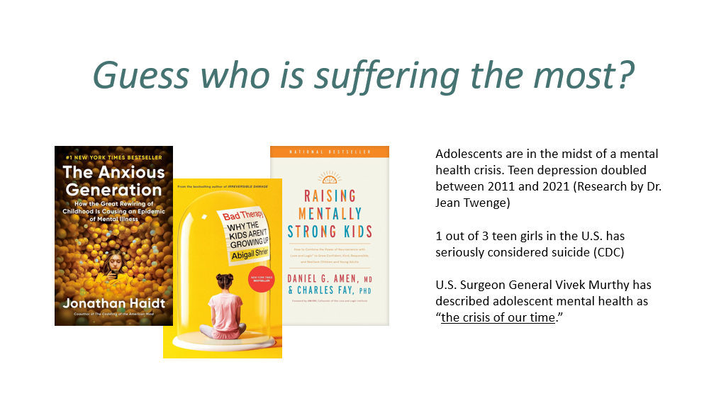 My children are 12, 9, and 5. So I’m thinking about them. How can I build their resiliency? And some of these statistics are just hard. A decade ago it wasn’t as bad, but it was bad. Now it’s this astronomical number.