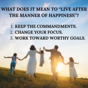 Nephi’s careful wording indicates that happiness is not just a feeling that sometimes occurs—it is connected to the way we live, and it is something we can work toward. In both good times and bad, we can choose to live as God lives and be blessed with His happiness. But what does it mean to “live after the manner of happiness”? Here are three suggestions: