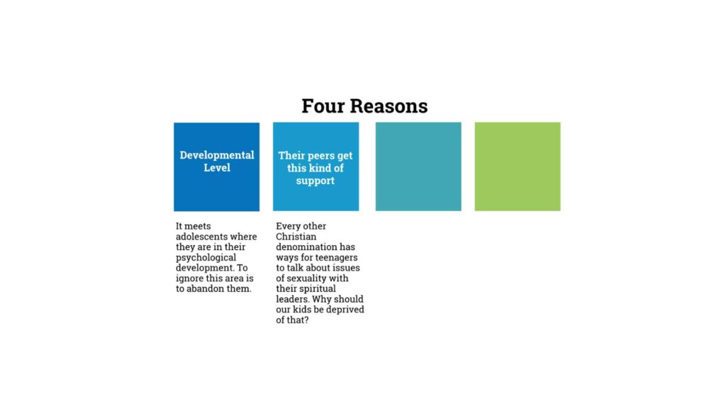 Number one: it’s appropriate for a teenager’s developmental level to be talking about this stuff. They are dealing with these issues already, we are not introducing these issues to them, they already are dealing with them. Most people would agree with that statement.