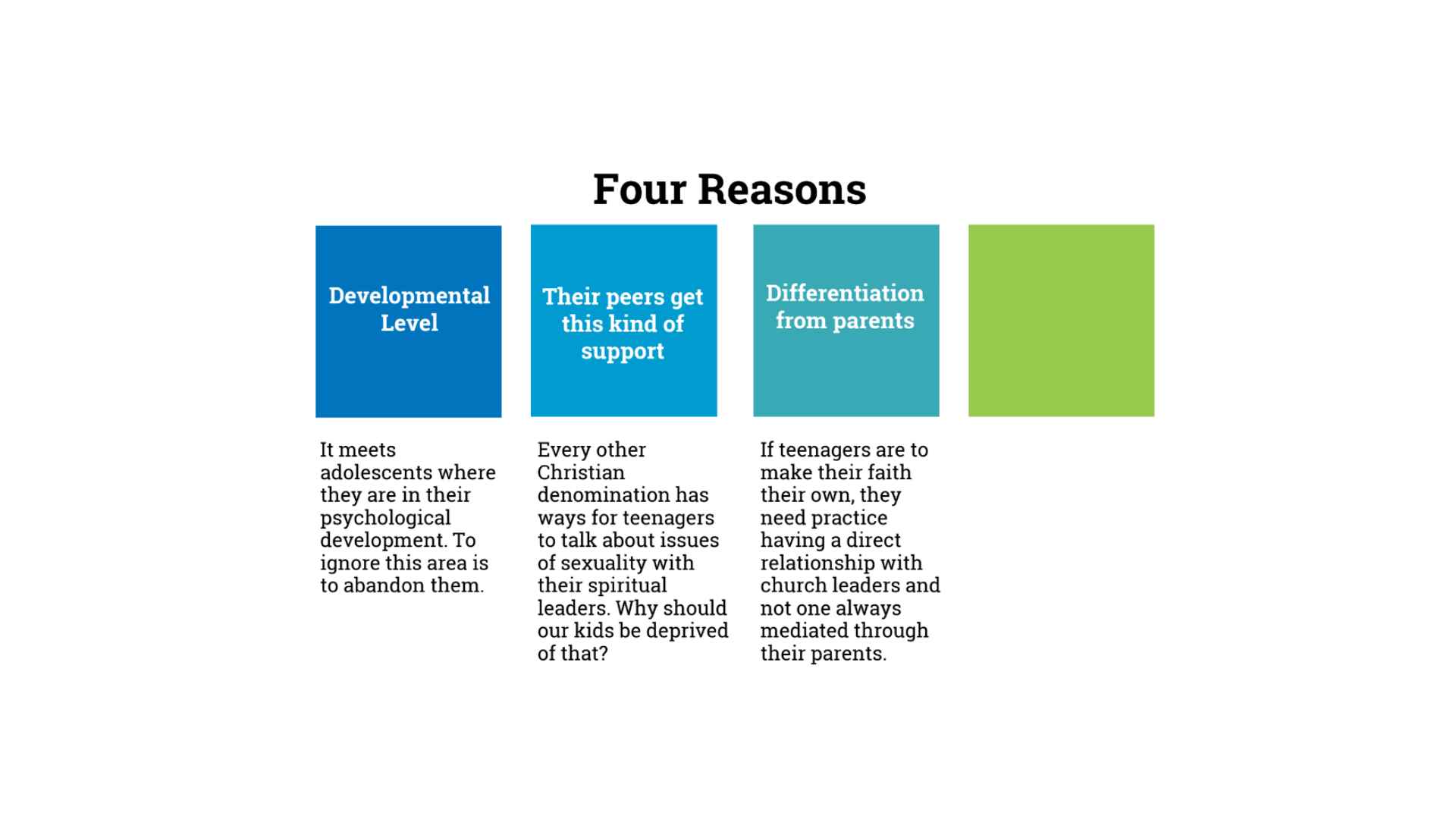 So, Protestant teens aren’t getting the benefit of getting the conversations at the top level, but they absolutely are having these conversations with the sort of junior level of leadership that is over them, and it often happens without parental knowledge or permission. In one non-scientific survey of Protestant leaders, the general consensus, over 80 percent, was that to refuse to talk about issues of chastity or sexuality with kids is to abandon them and to abdicate the responsibility over these kids that are in their care.