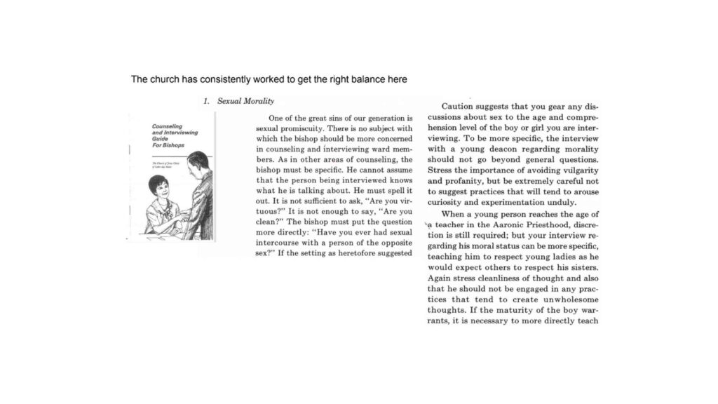 The Church has been offering advice on this topic for ages. This is a pamphlet from 1981, where the Church offers two paragraphs. This pamphlet is called Counseling and Interviewing Guide for Bishops. They offer two relevant paragraphs here. I’m not going to read them. The first one basically says sometimes you’re gonna have to be specific because your interviewee might want to be vague. The other one essentially says and you need to be age appropriate about what you’re asking. The Uplift data actually touches on this a little bit when asked if respondents believe that it’s appropriate to ask more specific questions to seventeen-year-old young men preparing for their mission. Almost everyone says yes, of course, more detailed questions for them than maybe a 12-year-old.
