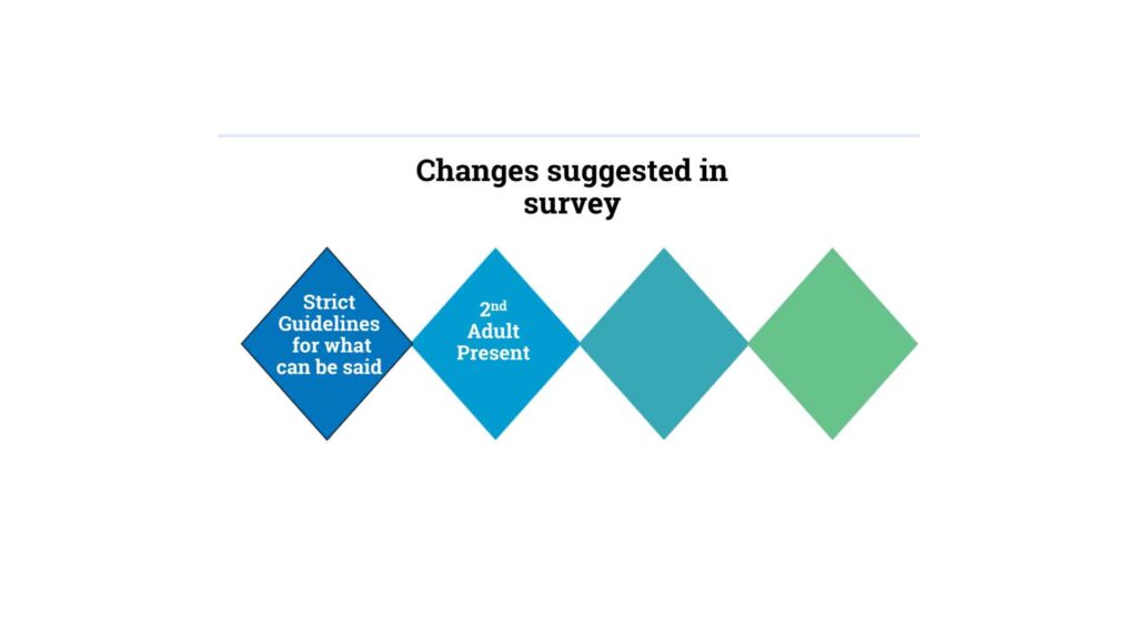 So other suggestions that are offered, that there should be a second adult present. This is a common one, but like everything else on this topic, it’s pretty complicated. For people who believe the chastity question is in and of itself inappropriate, that does not solve their problem. One respondent says, “How could it be better to have two adults asking my daughter inappropriate things? It’s still abuse; it’s just being done by two people now, so it doesn’t really solve that problem.” But still, 64 percent of people say it might be a good idea, and the current Church Handbook absolutely allows for this.