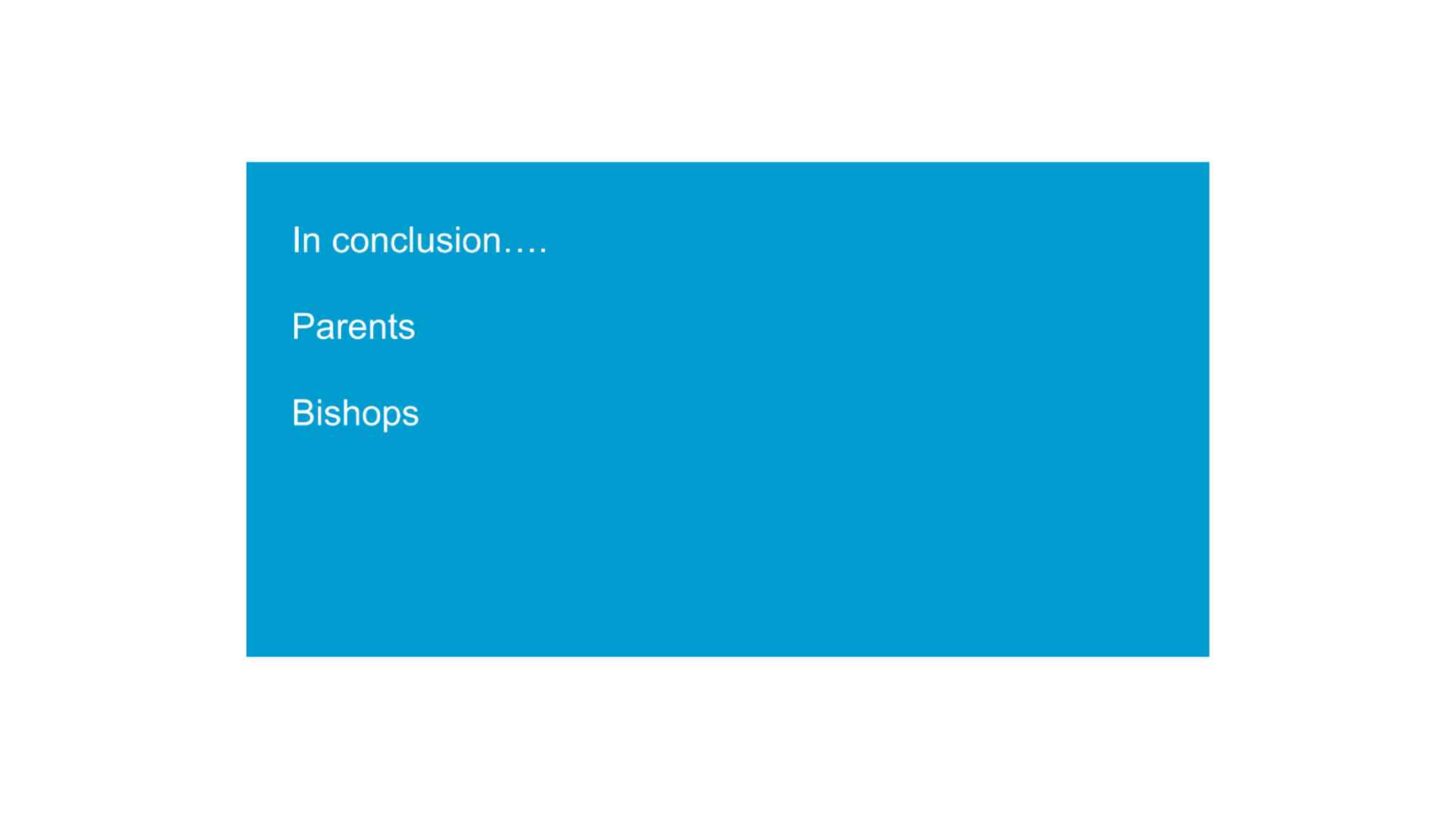 Bishops. Jesus tells a story about the shepherd who leaves 99 sheep and goes out and looks for the one, and in our context today, the one in my thinking is the young person who might disclose abuse. If you are able to, maybe be brave, maybe hear what they have to say. But what Jesus doesn’t talk about in that story is that the 99 might get real mad about it and it puts you in an impossible situation. And there’s a lot of voices that will tell you that asking teenagers hard questions is equal to abuse, and it’s not. You might actually be saving their life.