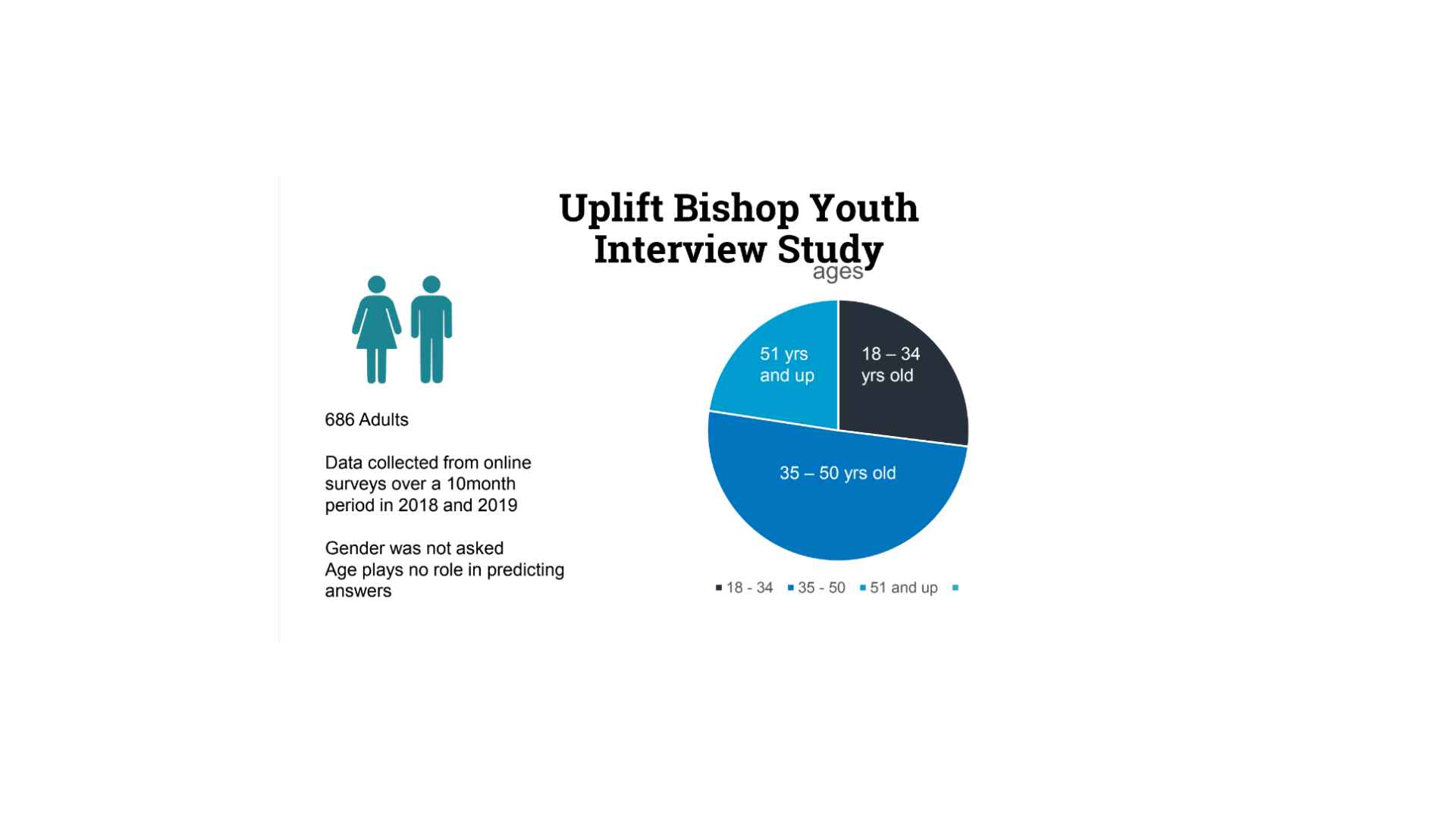 687 adults were surveyed for the Uplift Bishop Youth Interview Study. If you’re unfamiliar with Uplift, they are an online discussion group, probably a similar audience to what the FairMormon audience is; they’re people who are trying to remain faithful, but they’ve got some questions. There’d be some significant overlap, there’d also be some significant differences in those two audiences, but they’re not that much different than perhaps those who are listening today. Uplift collected this data over a 10-month period in 2018 and 2019. I was not involved in the data collection, but they have been kind enough to let me use this for my presentation.