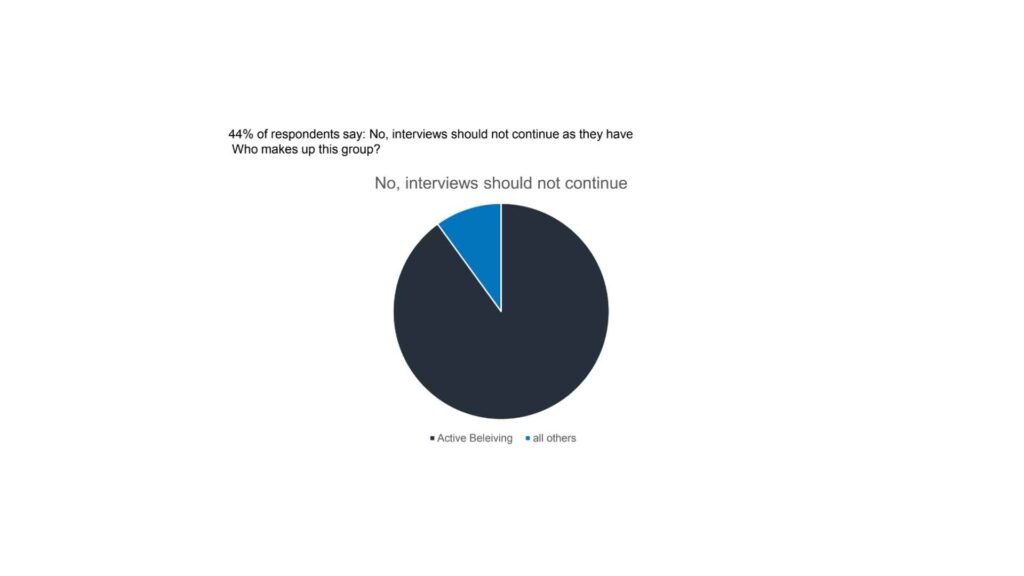 So, we start by looking at people’s experience with bishop interviews. Just a note, in our Church, change does not happen because of survey data, and this is not intended to be a petition for change. This is a snapshot of what people are feeling and thinking about this issue. So, the question is, should interviews continue as they have done, including asking questions of chastity? 56% of our respondents say yes. This number is made up of just over half of the participants describing themselves as believing in some way; they’re either believing active or believing less active. The remaining 44%, they don’t really possess any belief, and they still believe that interviews should continue and continue asking about chastity.