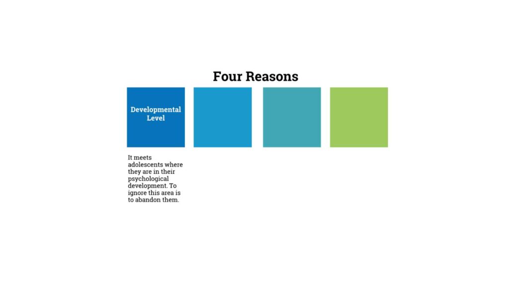 This, in no way, downplays the role of mom and dad and the importance of the family, it just recognizes that during adolescence, students are starting to sort of look up, look around the world, and they need to know that it’s not just their family who’s seeking to live out these principles, but other adults who know and care about them are doing it too. It’s no longer enough just to live out the faith of mom and dad.