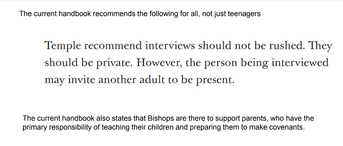 Another change that is offered is bishops should just ask, are you obeying the law of chastity? If the kid says, what’s the law of chastity? Bishops should end the interview, call in the parents, or phone up the parents and say, you need to explain to your kid what this means. This is a parent’s job, not a bishop’s job, and they end the interview there.