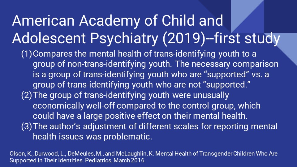 In 2019, the American Academy of Child and Adolescent Psychiatry released a “Statement Responding to Efforts to ban Evidence-Based Care for Transgender and Gender Diverse Youth.”[12] It’s directed at lawmakers who could outlaw puberty blockers and cross-sex hormones for minors. But it uses the same logic and the same sort of claim: “Research consistently demonstrates that gender diverse youth who are supported to live and/or explore the gender role that is consistent with their gender identity have better mental health outcomes than those who are not…These interventions may include social gender transition, hormone blocking agents, hormone treatment, and affirmative psychotherapeutic modalities.” It cites three studies in support.[13]