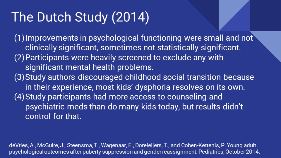 The Dutch study, from 2014, considers long-term outcomes for 55 transgender-identifying young adults who received puberty suppression, cross-sex hormones, gender re-assignment surgery, and other treatment and evaluation as teenagers from a clinic in the Netherlands. It concludes that they are happy and psychologically well-functioning. Advocates want you to just stop your analysis at this point, but we’re going to dig in to the details.