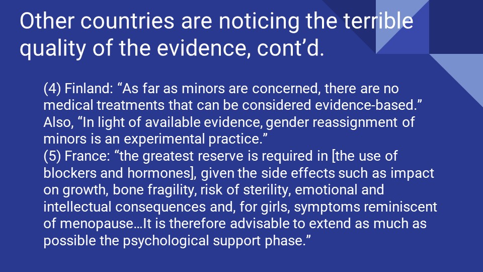 In Finland, “As far as minors are concerned, there are no medical treatments that can be considered evidence-based.” Also, “In light of available evidence, gender reassignment of minors is an experimental practice…Information about the potential harms of hormone therapies is accumulating slowly and is not systematically reported. It is critical to obtain information on the benefits and risks of these treatments in rigorous research settings.”[44] In France, the National Academy of Medicine notes there is no way to reliably diagnose durable transgender identification as opposed to transitory social contagion, and advises: “the greatest reserve is required in [the use of blockers and hormones], given the side effects such as impact on growth, bone fragility, risk of sterility, emotional and intellectual consequences and, for girls, symptoms reminiscent of menopause…It is therefore advisable to extend as much as possible the psychological support phase.”[45]