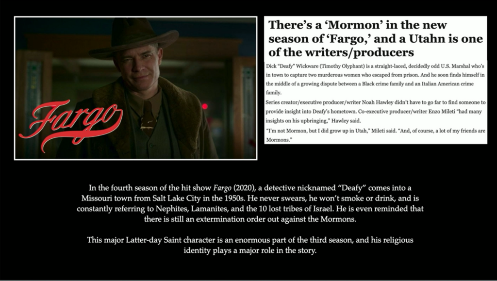 Fargo, a very, very good and well made TV show. In its most recent season, 2020, it features Detective Deffy, who comes into Missouri from Salt Lake City in the 1950s. He never swears, won’t smoke or drink, and is constantly referring to the Nephites, Lamanites, and the 10 lost tribes of Israel. He’s even reminded that there is still an extermination order against him.