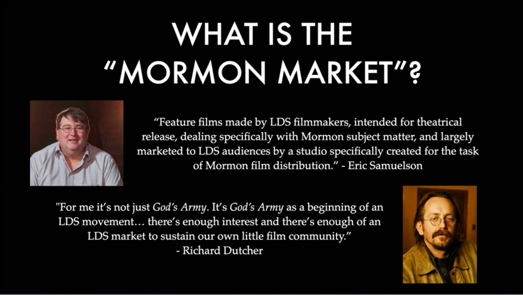 The Mormon market can be defined as feature films created by LDS filmmakers for theatrical release, focusing on Mormon subject matter and primarily marketed to LDS audiences by a studio established specifically for Mormon film distribution. Richard Dutcher, with the film God’s Army, aimed to build a market within the LDS community.