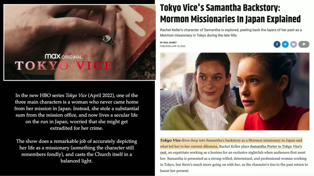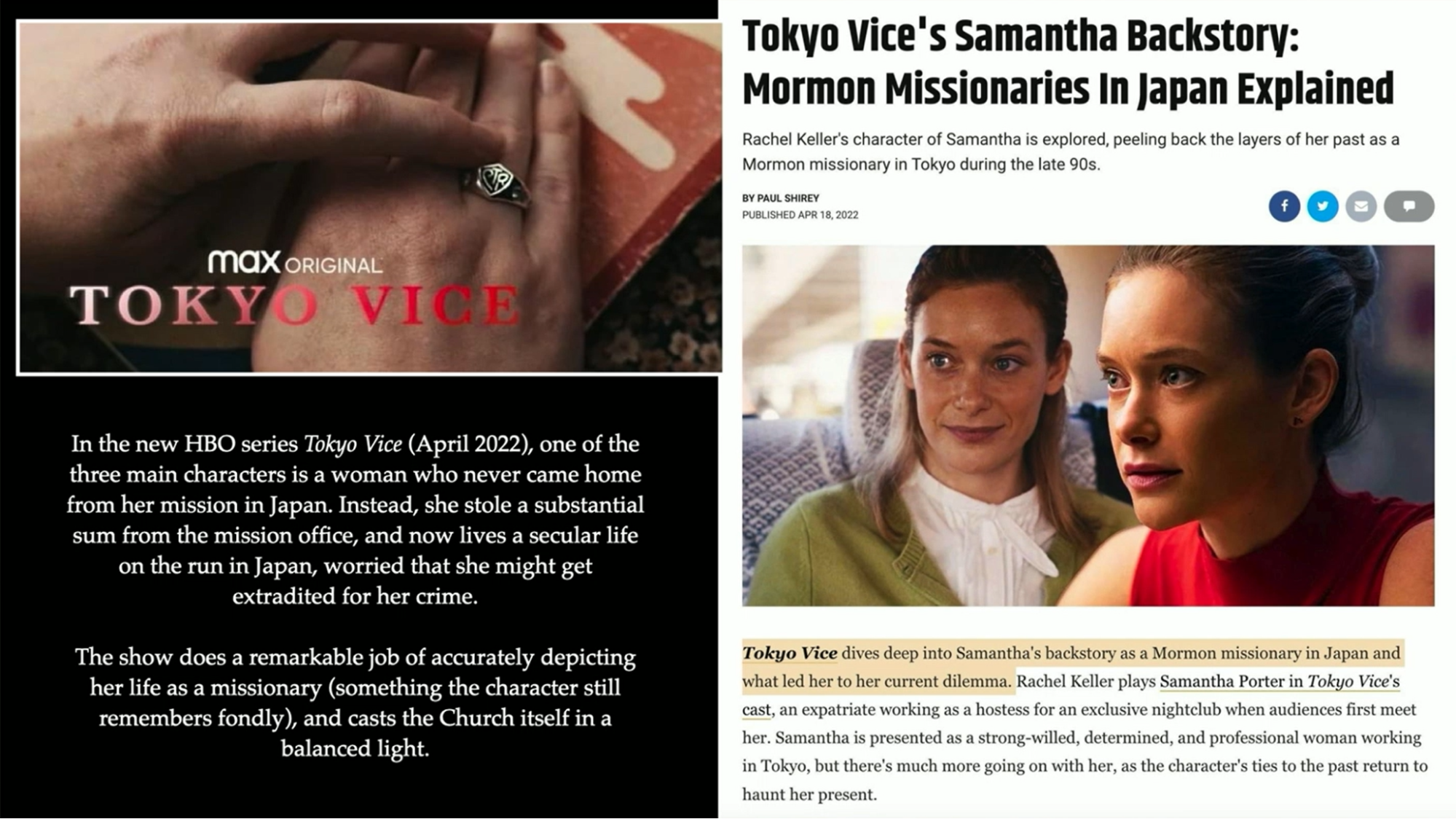 In Tokyo Vice, which is like a journalistic thriller show, one of the characters is a woman who was a missionary and then ended up stealing from her mission, and staying in Japan and fleeing.  A private detective is hired to go find her and bring her back to the United States. But she looks back very fondly on her mission and wishes that she had that more pure, simple life of being a missionary. I was surprised at how accurate they portrayed Latter-day Saint missionaries. This was in 2022; it just came out in April.