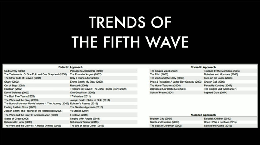 To give you a brief summary, what has been termed Mormon Cinema, I now call Latter-day Saint Cinema out of respect for proper terminology. Mormon Cinema stretches back to the early 1900s, divided into five waves, as found in A History of Mormon Cinema, an essay part of the BYU Studies book about Latter-day Saints and film.