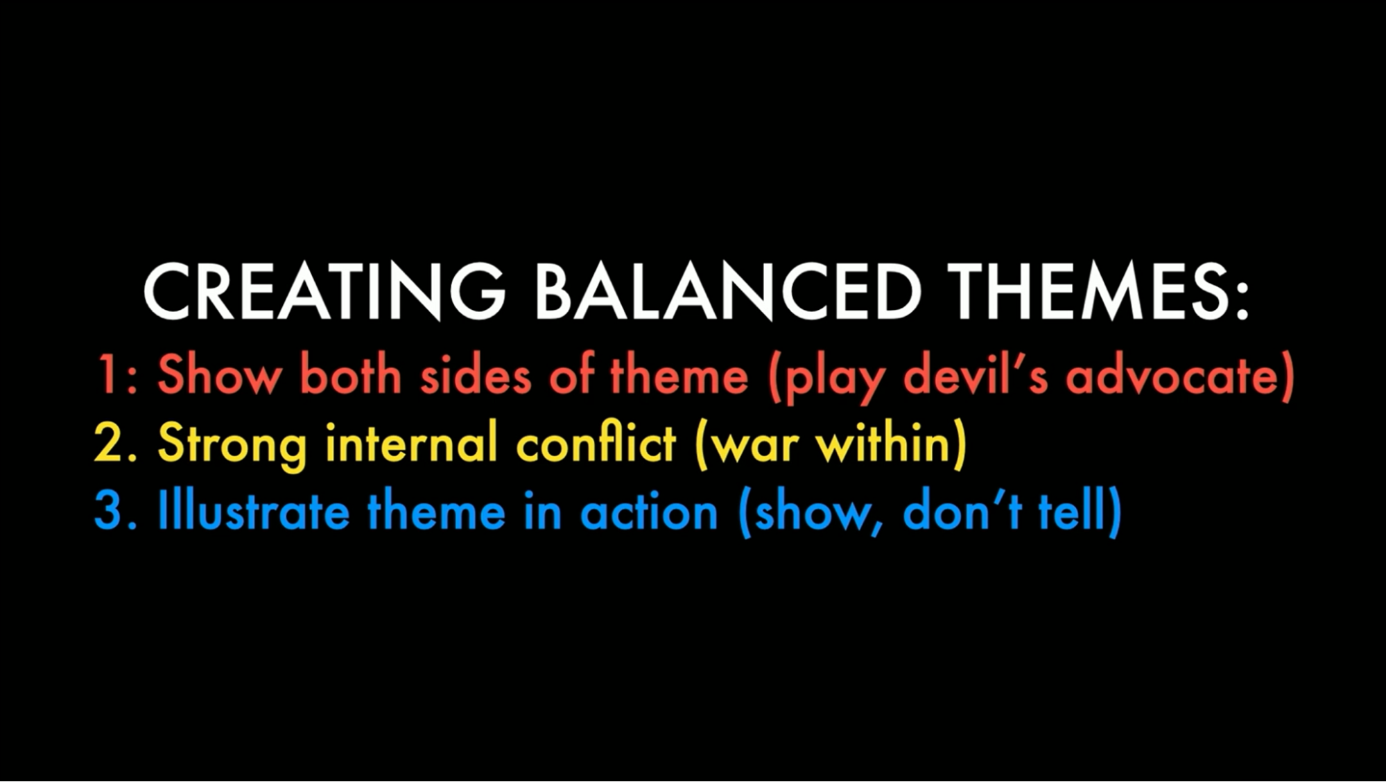 • Show both sides of the theme. Play devil’s advocate with your own themes and your own beliefs. Ultimately, if you have something you want to say by the end of the film, say it. But play devil’s advocate with it. We need more conflict and scrutiny, especially if the message is going to land.