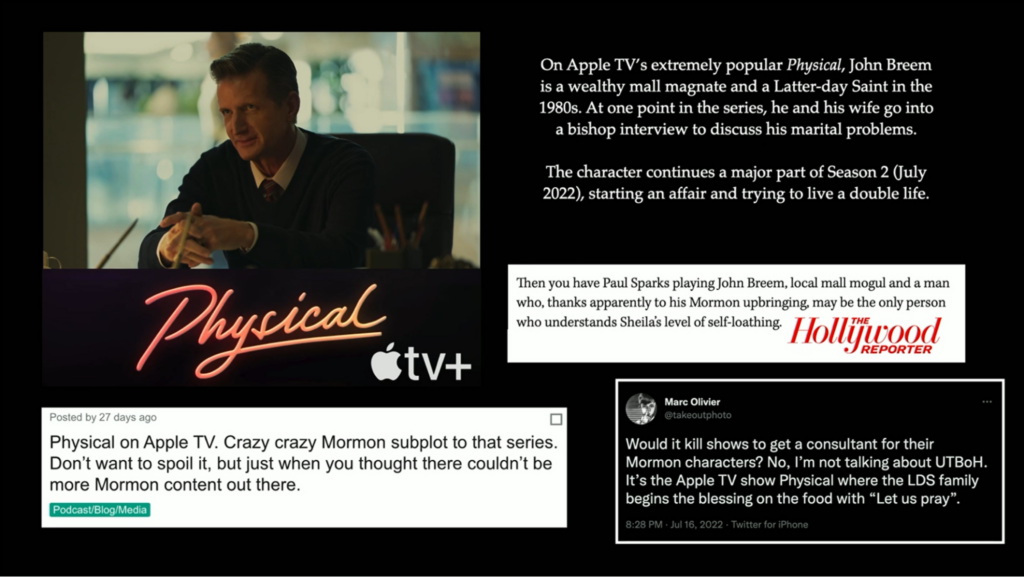 TV show, Physical on Apple TV, Season 2 (2022), set in the 1980s, there is a wealthy Latter-day Saint mall owner and his wife who seek a bishop’s help for marital problems. He’s not a favorably depicted character, but that’s who they go to, who they want to explore.