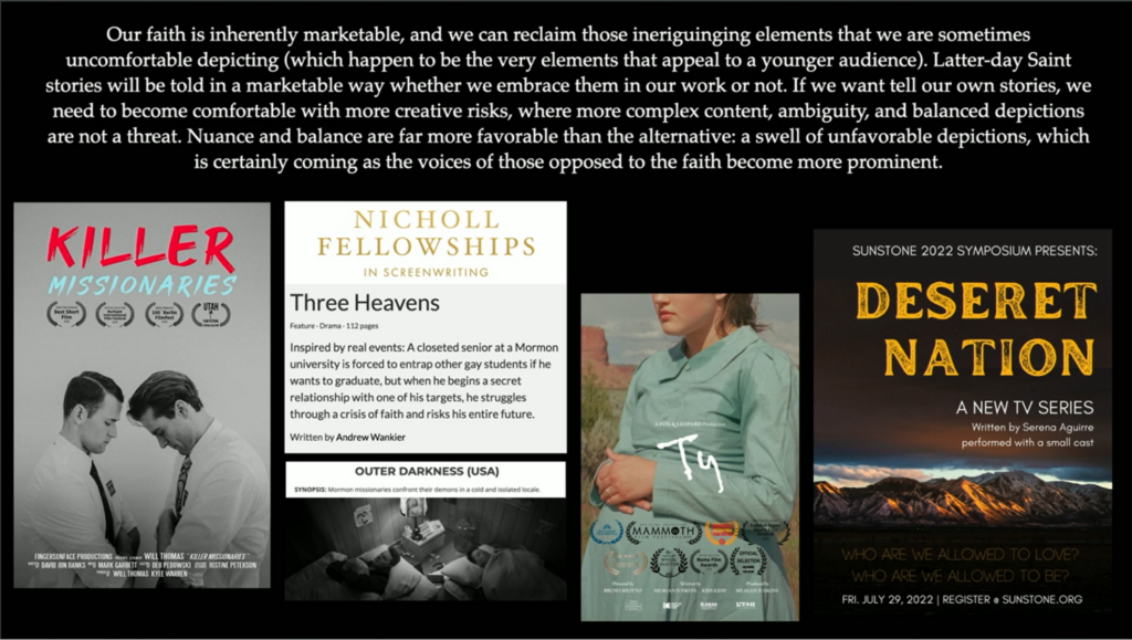 Personally, I’ve observed that our faith movement functions as a strange attractor. Friends who have submitted scripts or pitched concepts get more attention outside of our community, when incorporating Latter-day Saint elements, not in a preachy or protective way, but in an honest portrayal, expressing the uniqueness of our community. These stories garnered attention, feedback, and prestige.