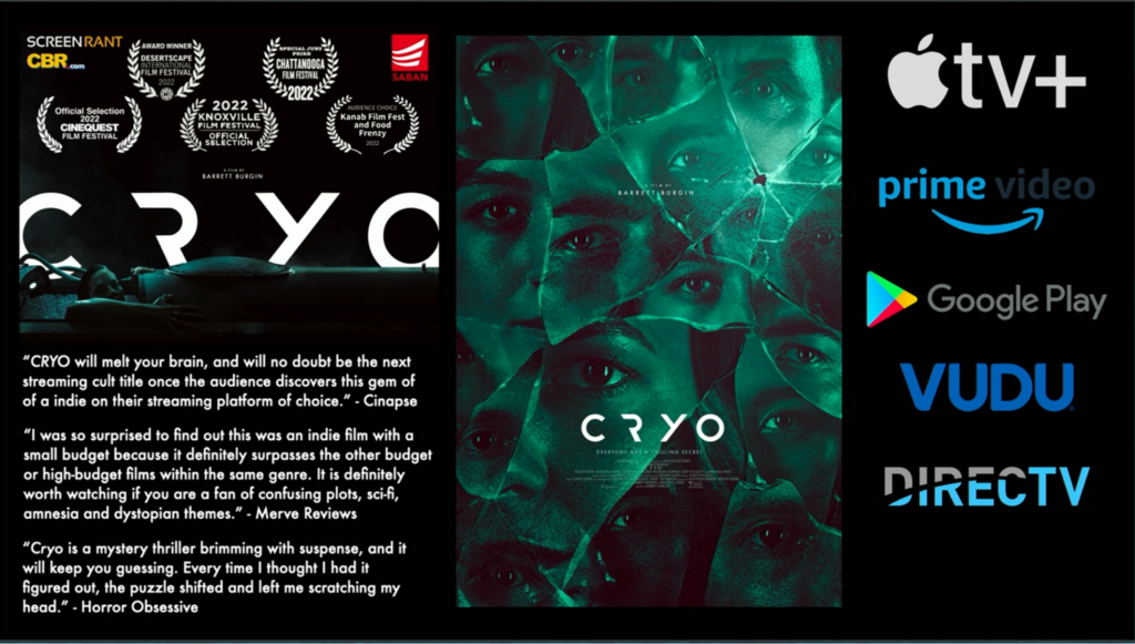 Most recently, I finished a feature film co-written with my colleague, sold to Sabon Pictures, called Cryo. It’s my darkest picture, a sci-fi thriller murder mystery available on Apple TV, Prime Video, Google Play, Vudu, Direct TV, among other platforms. It won several awards in various festivals, and incorporates aspects of my faith as a Latter-day Saint.