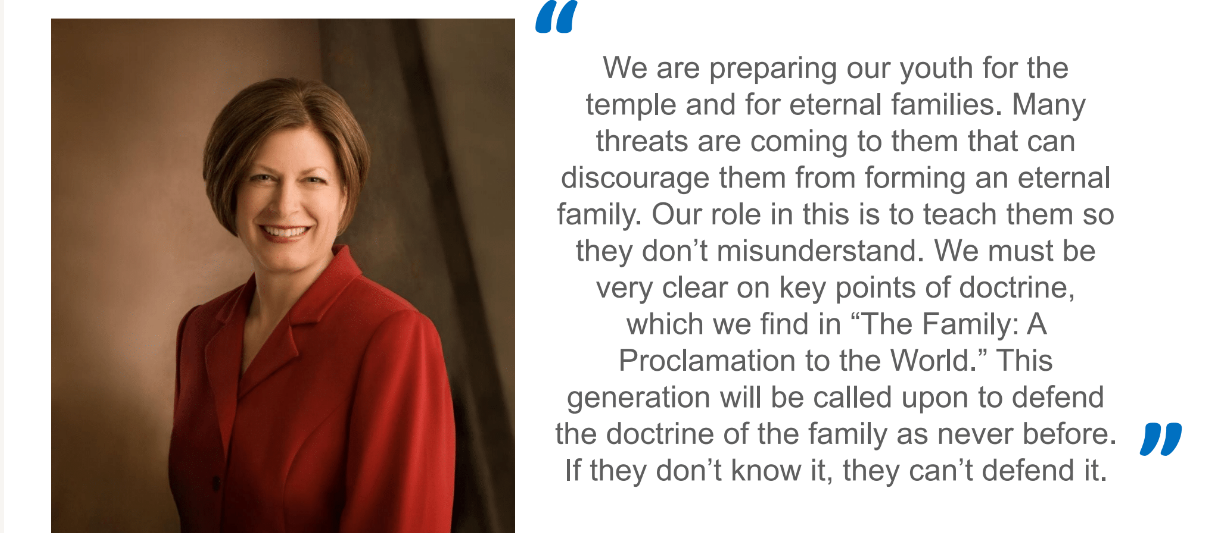Our role in this is to teach them so they don’t misunderstand. We must be very clear on key points of doctrine, which we find in The Family: A Proclamation to the World. This generation will be called upon to defend the doctrine of the family as never before. If they don’t know it, they can’t defend it.”