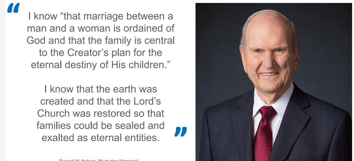 Here he talks about, you’re all familiar with the scripture in Doctrine and Covenants section 49 verses 15 and 16. Here President Nelson reaffirms a truth taught to the Prophet Joseph Smith, that marriage is ordained of God and that the very purpose of the earth’s existence and its creation is fulfilled through marriage, and of course what comes through eternal marriages.