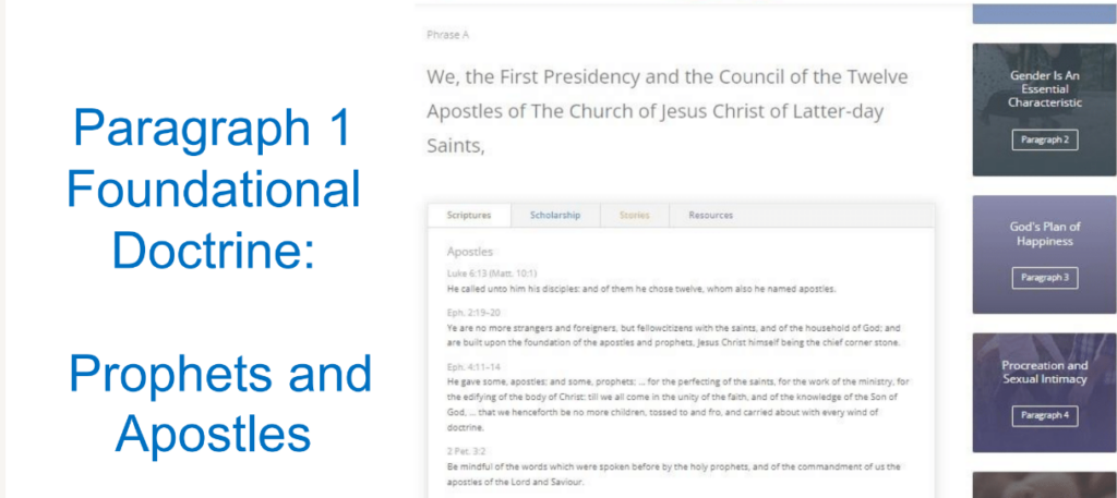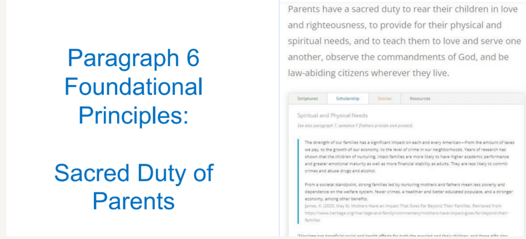 And so, if you go to paragraph one for instance, on the website you will see that you can pull up scriptures from the our canon, the Old & New Testament, Doctrine and Covenants, Pearl of Great Price, and Book of Mormon, as well as quotes from modern prophets, about the principles. Sometimes it’s just a phrase, sometimes it’s a line, sometimes it’s a word, but you will see scriptural support for the principles in the family proclamation.