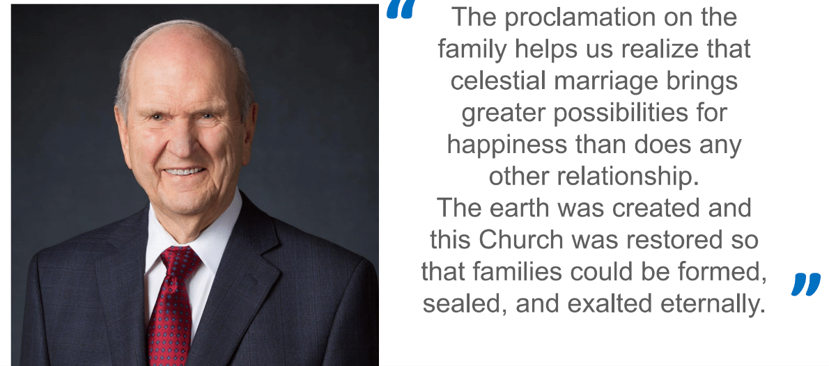 Here he says that the proclamation of the family helps us realize that celestial marriage brings greater possibilities for happiness than does any other relationship. The earth was created and this Church was restored, so that families could be formed, sealed, and exalted eternally.