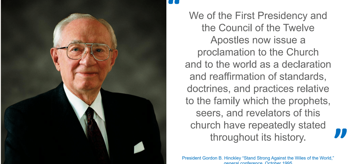 And we’ve got some quotes here. We start here with this first quote from President Hinckley when he introduced this, mentioning that he and the rest of the First Presidency and Quorum of the Twelve were going to issue a proclamation to the world to reaffirm standards, doctrines, and practices relative to the family, which prophets, seers and revelators of this Church have repeatedly stated throughout its history.