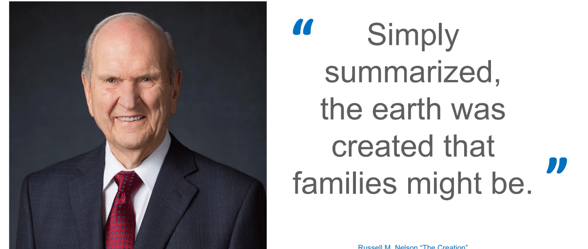 We’ve pulled a few quotes here in the presentation talking about the importance to our theology that the family has in the creation of the earth. Again, she reiterates the same principle: the creation of the earth was so that families could live, and that it is not just the case or happenstance that God formed Adam and Eve to form a marriage, but that was why they were here. This was not just something that was happenstance upon the earth forming, it was part of the plan that they would be sealed as a family unit.