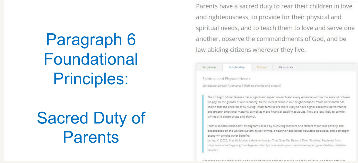 If you go to the scholarship, you’ll also see some secular scholarship that supports the principles that are in the family proclamation, and then also the stories tab. You will see stories where people talk about how these principles have had application in their lives.