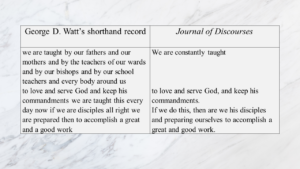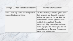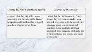 We owe a tremendous debt to George Watt for his shorthand record, which is an invaluable resource in church history and for items he transcribed and published. I cannot overstate that. But while we neither condemn nor excuse Watt’s changes, it is vital that we understand that what was published differs, often significantly, from what the speakers actually said. That what we read in the Journal of Discourses and in the Deseret News (which is the same material) is too often the words of George Watt and other shorthand reporters, not the words of Brigham Young and other speakers.