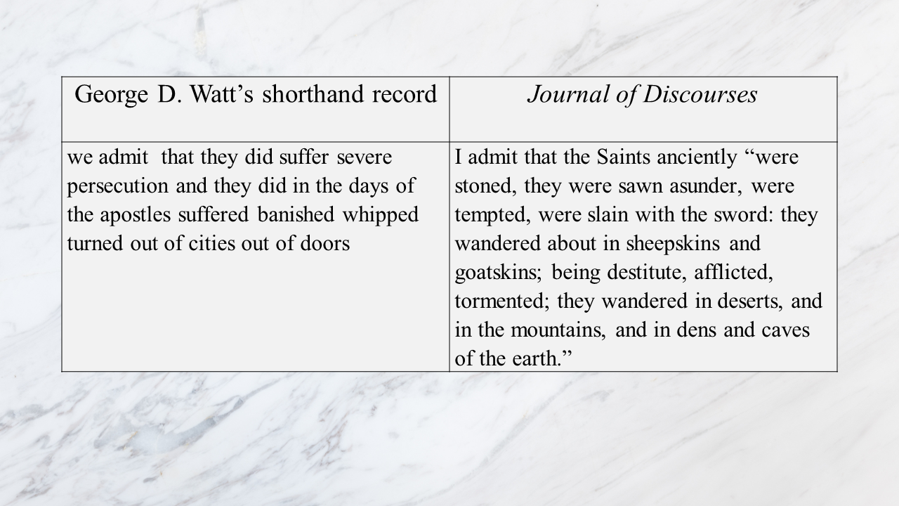 “We admit that they did suffer severe persecution. And they did in the days of the apostles suffered, banished, wept, turned out of cities and out of doors.” Note, also, the change from the inclusive “we” in the shorthand to the “I” in the Journal of Discourses. Brigham Young was much, much, much more inclusive in his speaking, as he really spoke.