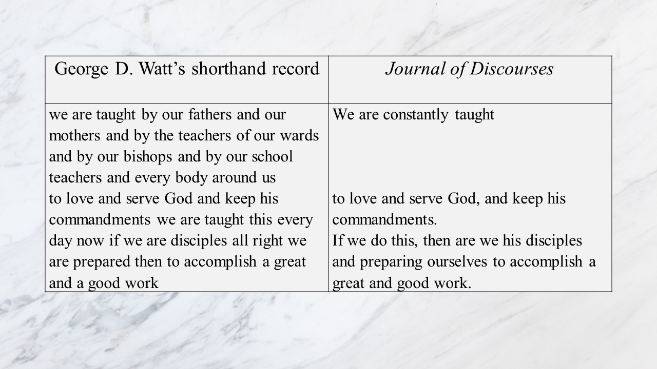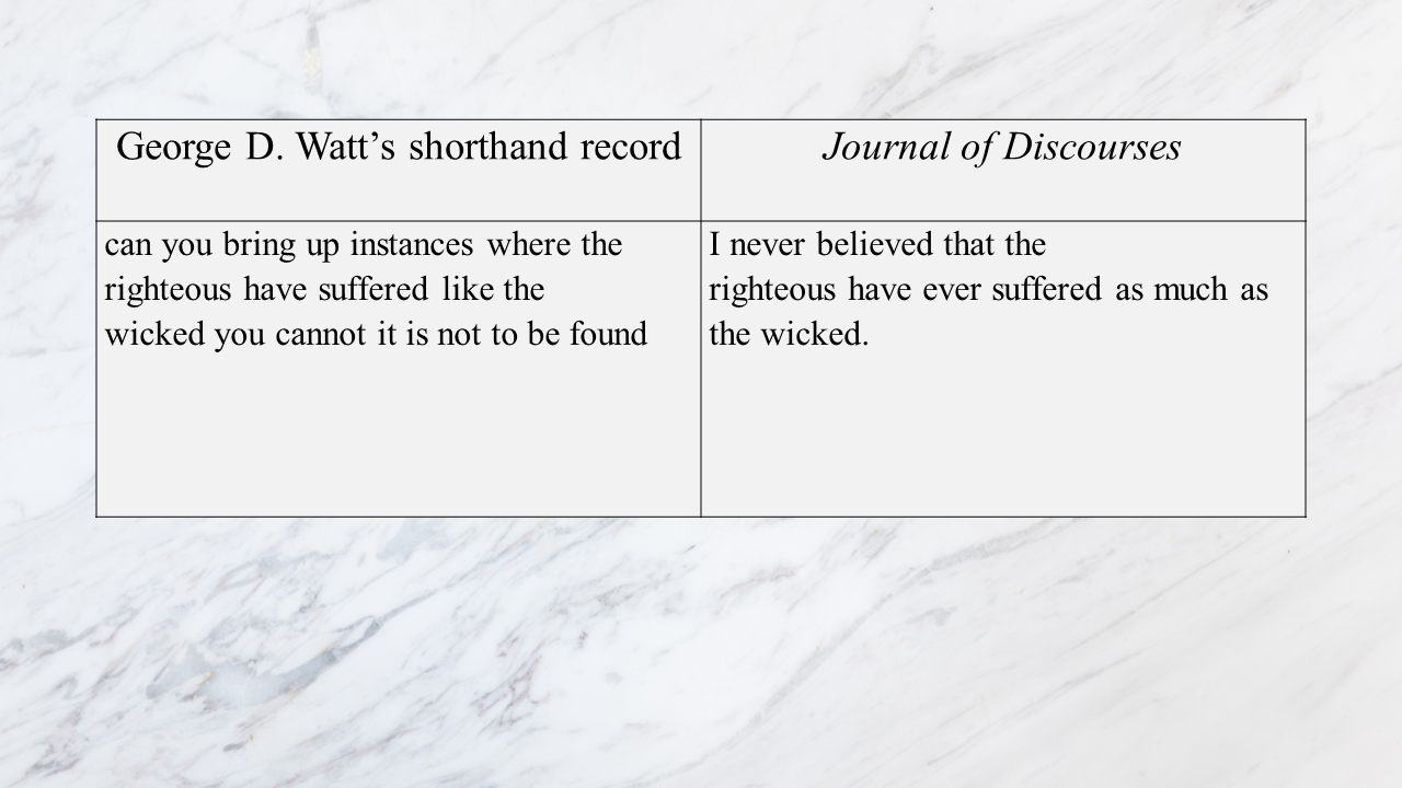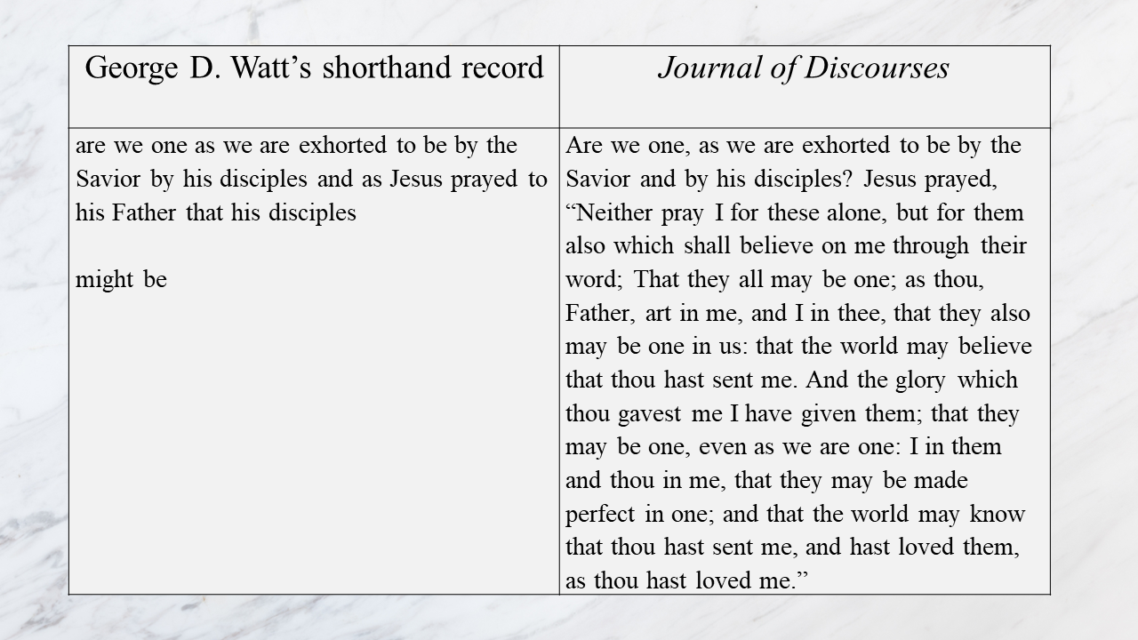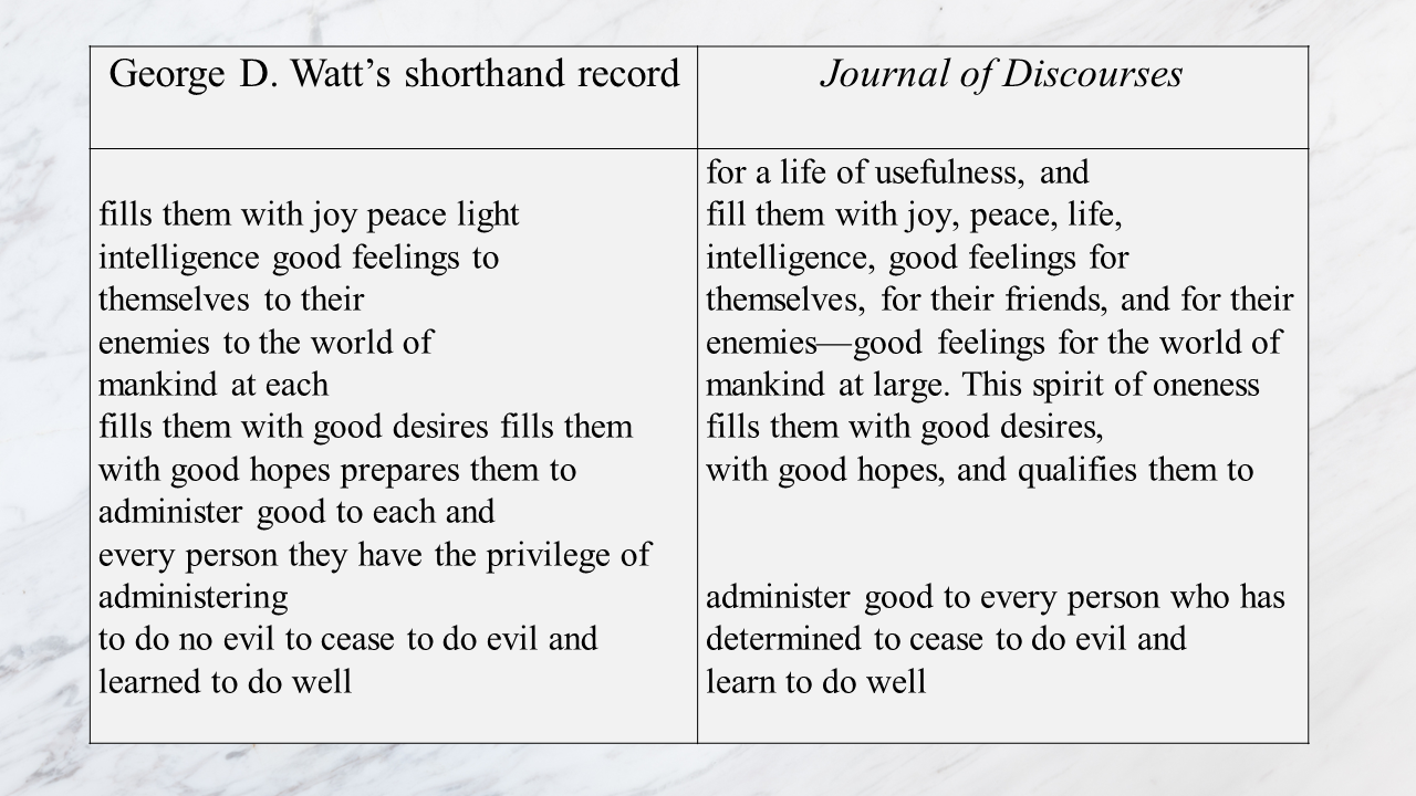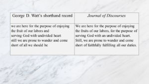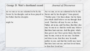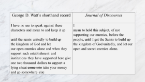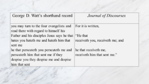 I have spent many, many years transcribing the shorthand of George D. Watt and others. And through this work, I have learned how his long-hand transcripts of his own shorthand, and the published versions of those transcripts differ, often significantly, from his original shorthand record; the transcripts and published versions of other shorthand writers also differ from their shorthand records.