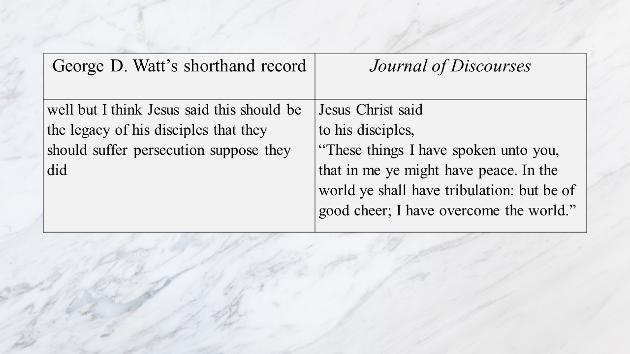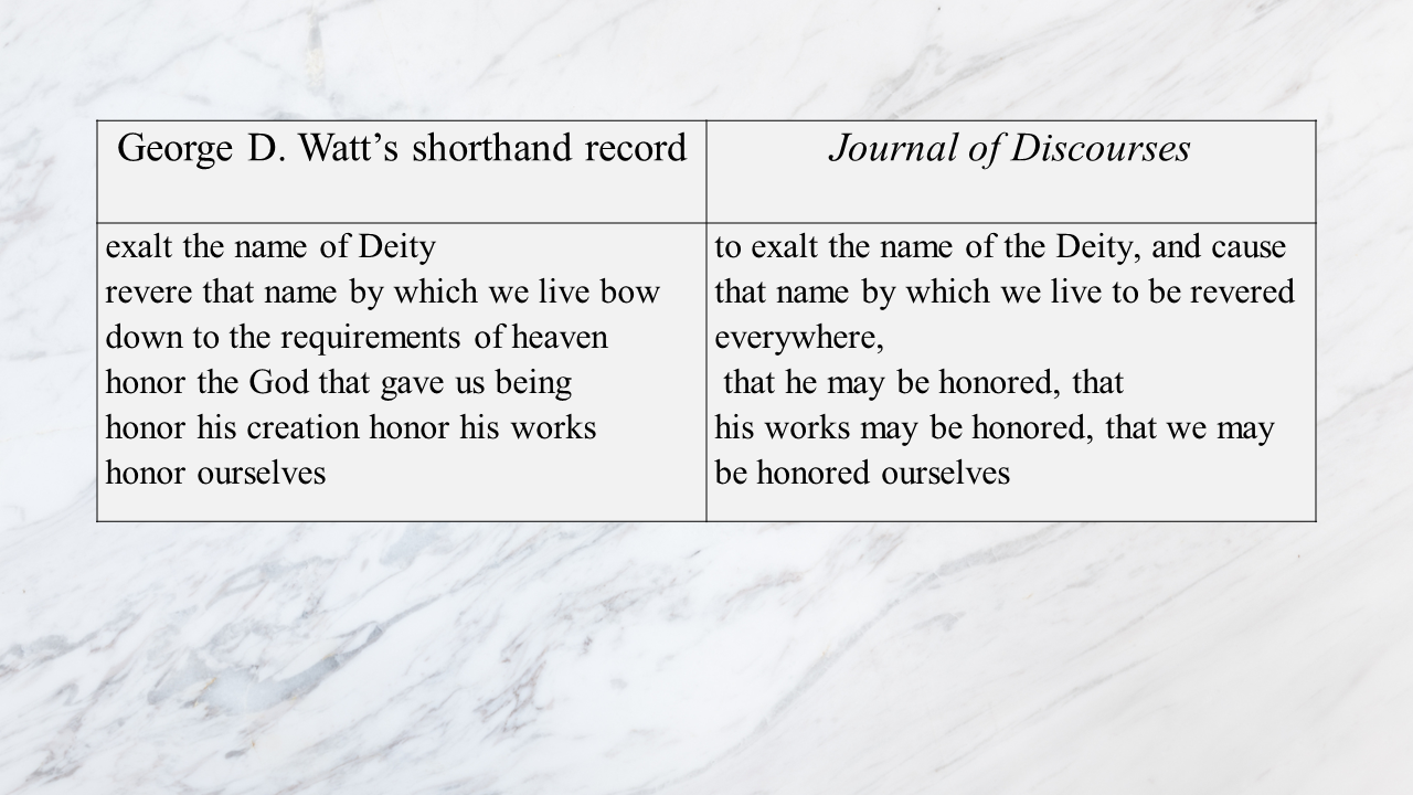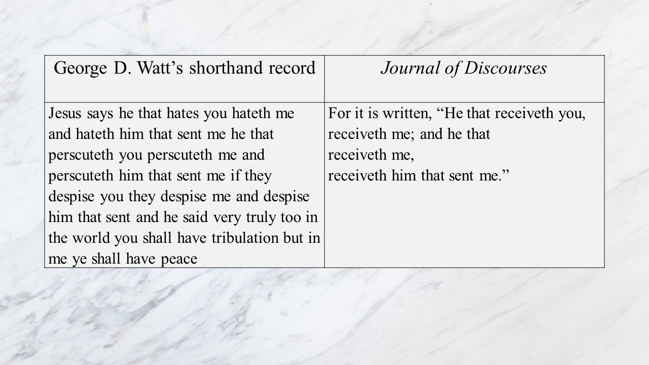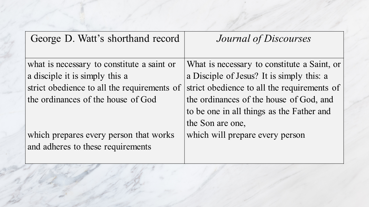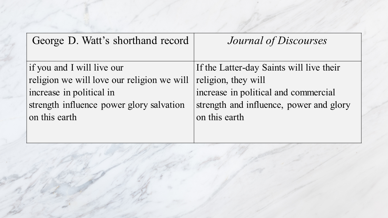 I have spent many, many years transcribing the shorthand of George D. Watt and others. And through this work, I have learned how his long-hand transcripts of his own shorthand, and the published versions of those transcripts differ, often significantly, from his original shorthand record; the transcripts and published versions of other shorthand writers also differ from their shorthand records.