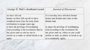 That same year, Isaac Pitman published his new shorthand method, Pitman shorthand. It was the first English shorthand that permitted a skilled reporter to report what a speaker said verbatim — at least until the speaker became excited or angry and sped up. These two events converged. The shorthand records written by George D. Watt in Pitman shorthand include some of the most significant records of 19th century church history.