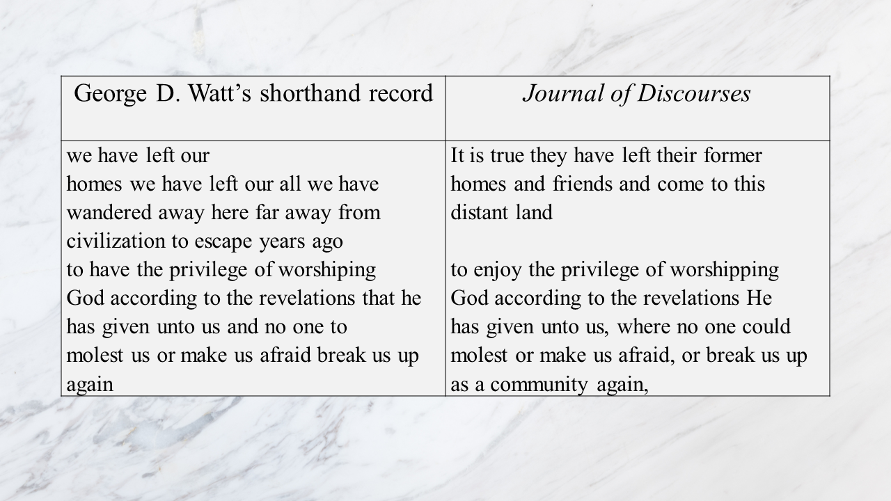 “We have left our homes we have left our all we have wandered away here far away from civilization to escape years ago to have the privilege of worshipping God according to the revelations that he has given unto us and no one to molest us or make us afraid break us up again.” The shorthand is much more inclusive – “we” instead of “they.” Again, in the Journal of Discourses as “they” and then it goes back to “us.”