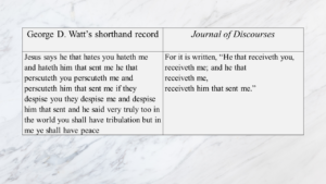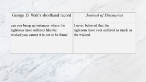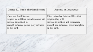 Watt added many words and phrases to the Journal of Discourses that are not in the shorthand record at all. Sometimes the content of a passage is completely unrelated to the shorthand, as here. In this talk, when I have them in parallel columns, the content just before this quote, the shorthand and published versions agree — maybe not perfectly, but they agree. And in the content just after this quote, they also agree. But you can see here that they are completely different.