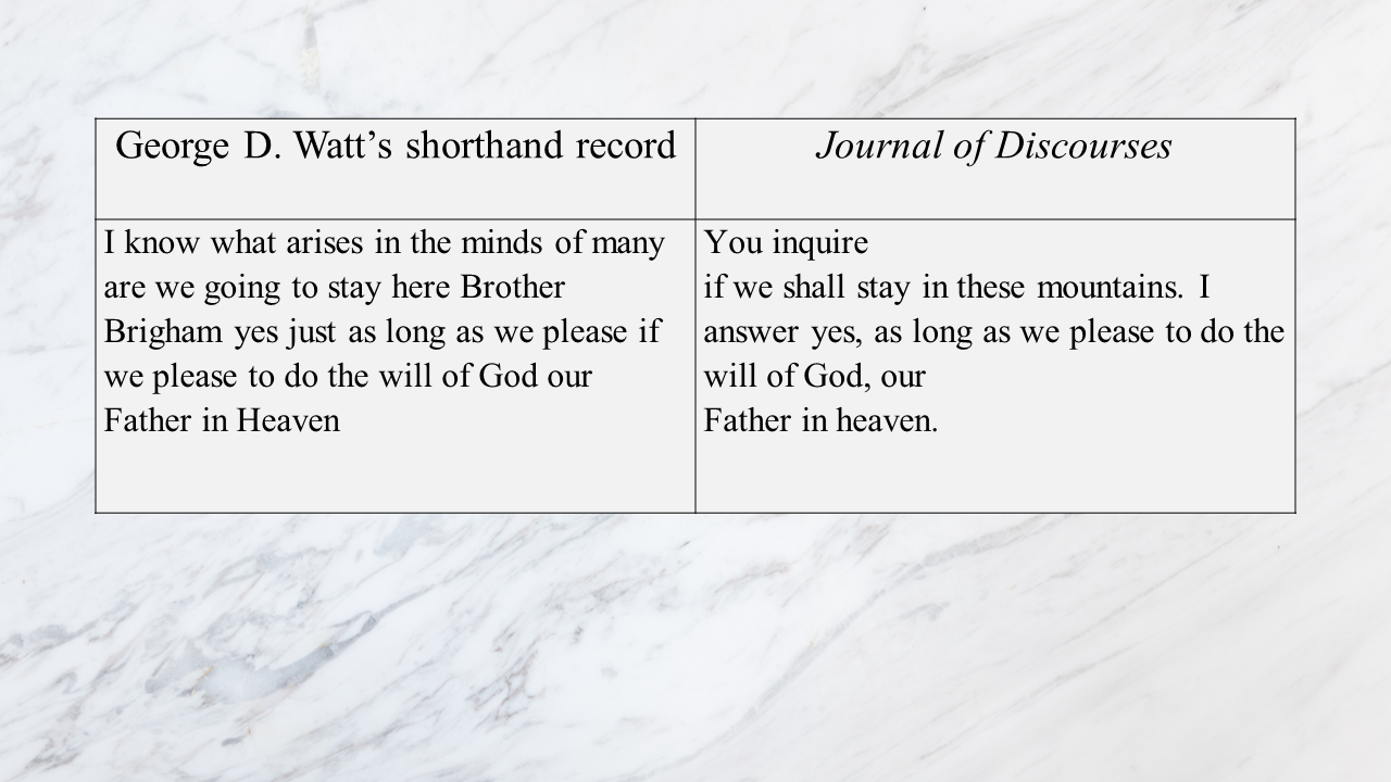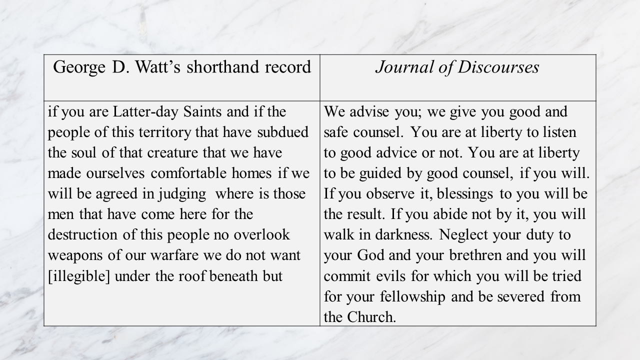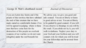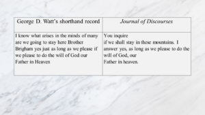 Note also the change from “until the saints” in the shorthand to “until I get the saints” in the Journal of Discourses. Changes like this portray Brigham Young as far more authoritarian than his real words.