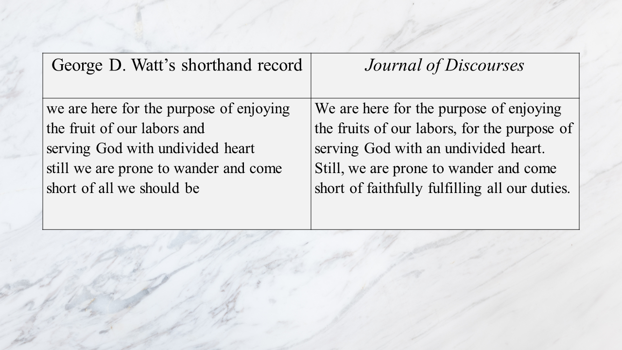 Watt did not transcribe many words, phrases, even long sections of the shorthand record. Now some passages he apparently omitted because the shorthand became difficult. It is difficult. I remember when I discovered that time after time after time when I ran into trouble with the shorthand and referred to the Journal of Discourses for vocabulary, the section just wasn’t there. But other times he omitted material, and we have no idea why.