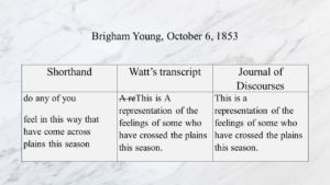 Shorthand is a quick way of writing. You’ll see an example here. This is what I read. It took me 30 years, from when I first learned shorthand, to be able to read George D. Watt’s shorthand: 30 years and thousands of hours of work. Shorthand is a quick way of writing using curved and straight lines, circles, dots, dashes, and other symbols to record the sounds of words. These symbols often have multiple meanings. Shorthand is cryptic, often ambiguous, and a challenge to read. Sometimes it’s like putting together a jigsaw puzzle, especially when read by a person who didn’t write it. When a person writes shorthand, they have a memory of what was said, and they also know how they write shorthand. I wasn’t there when Brigham Young and others spoke.
