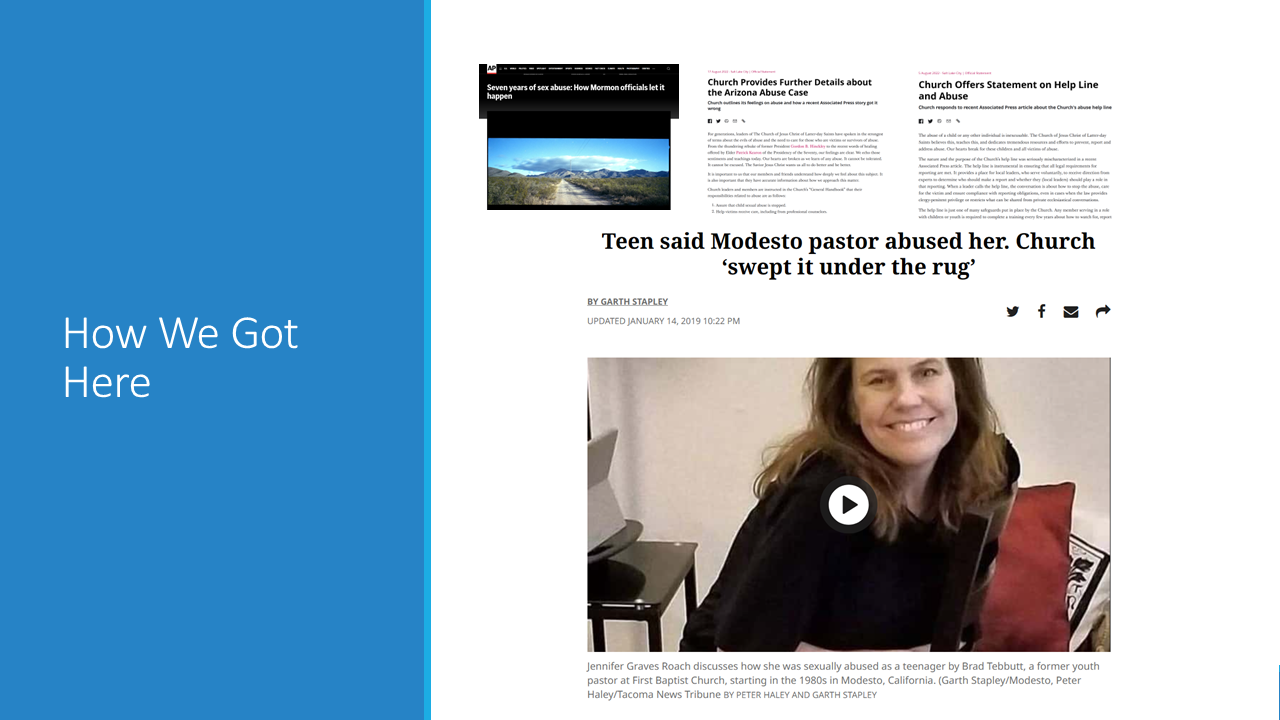 To answer some questions (and I’m trying to do my notes and my clicker at the same time). I happen to know some things about good tellings of abuse stories and bad tellings. If you have watched my podcast at all you might have seen the episode that’s my conversion story. My conversion story runs right through the middle of abuse in the media stories. My hometown newspaper, the Modesto Bee, ran a story about the church where I grew up (I grew up outside of the LDS church), where one pastor after another abused teenagers in this church — and I was one of them. The paper wrote about this. You can listen to the experience that I had and it’s actually how I ended up here in our church.