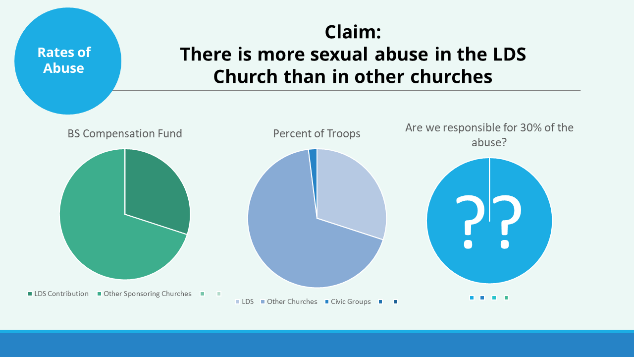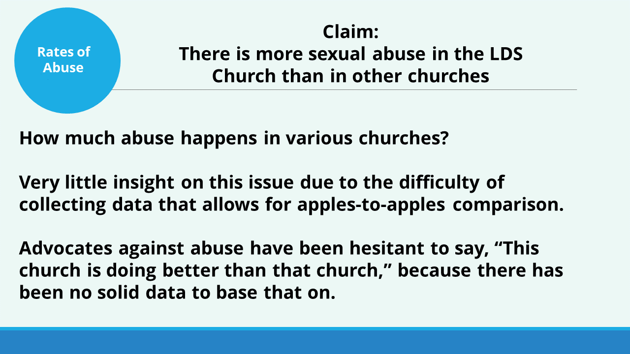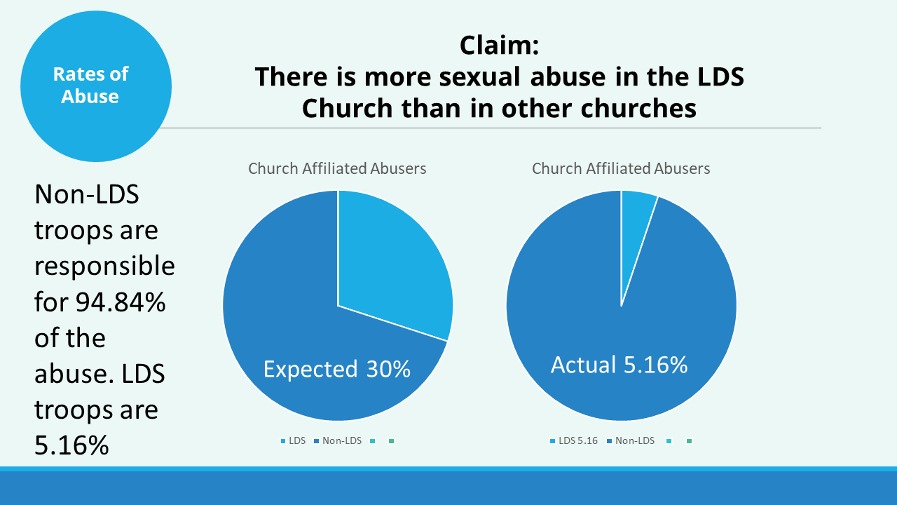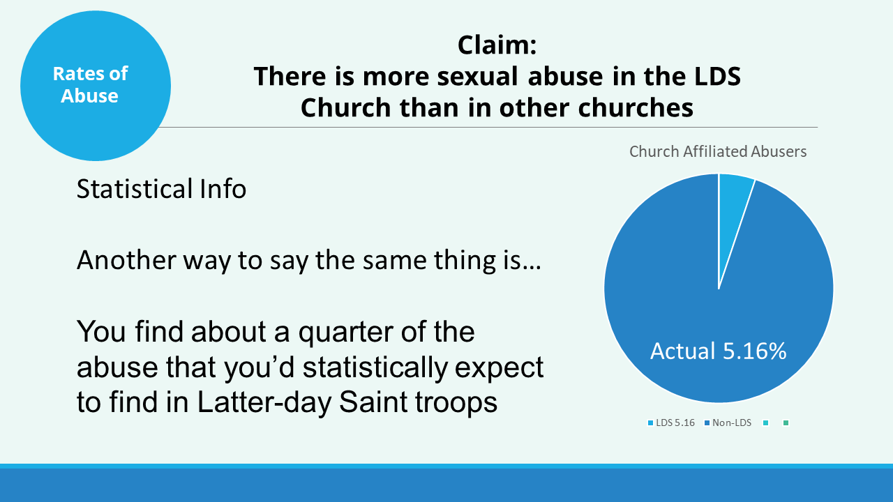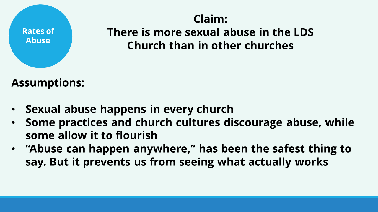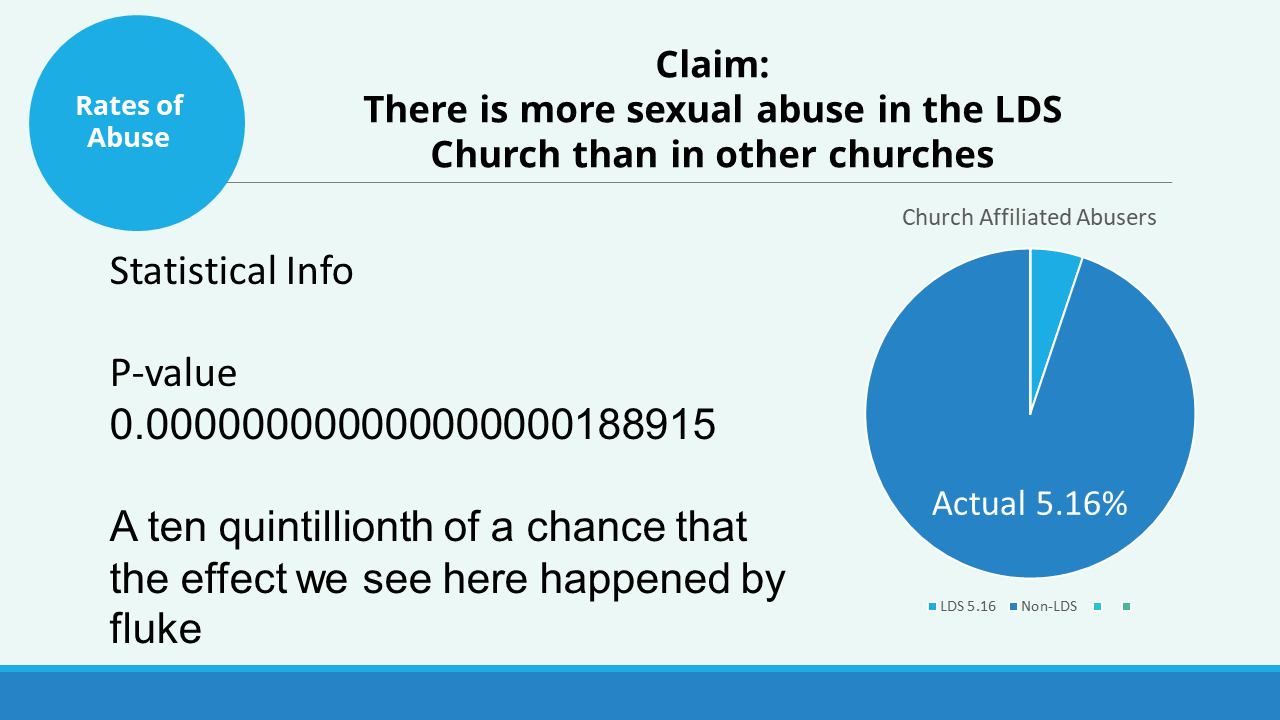 The claim is that there has been more sexual abuse in the LDS church than in other churches. The evidence says there’s actually statistically, provably less abuse — at least in this dataset, At least when we’re looking at these numbers. I don’t know how to get access to other numbers to look at them. If you do, please tell me — but the one dataset that we have access to, it’s significantly less.