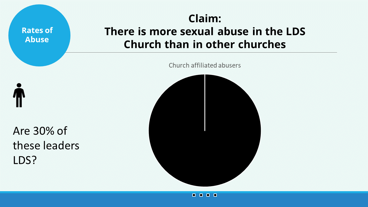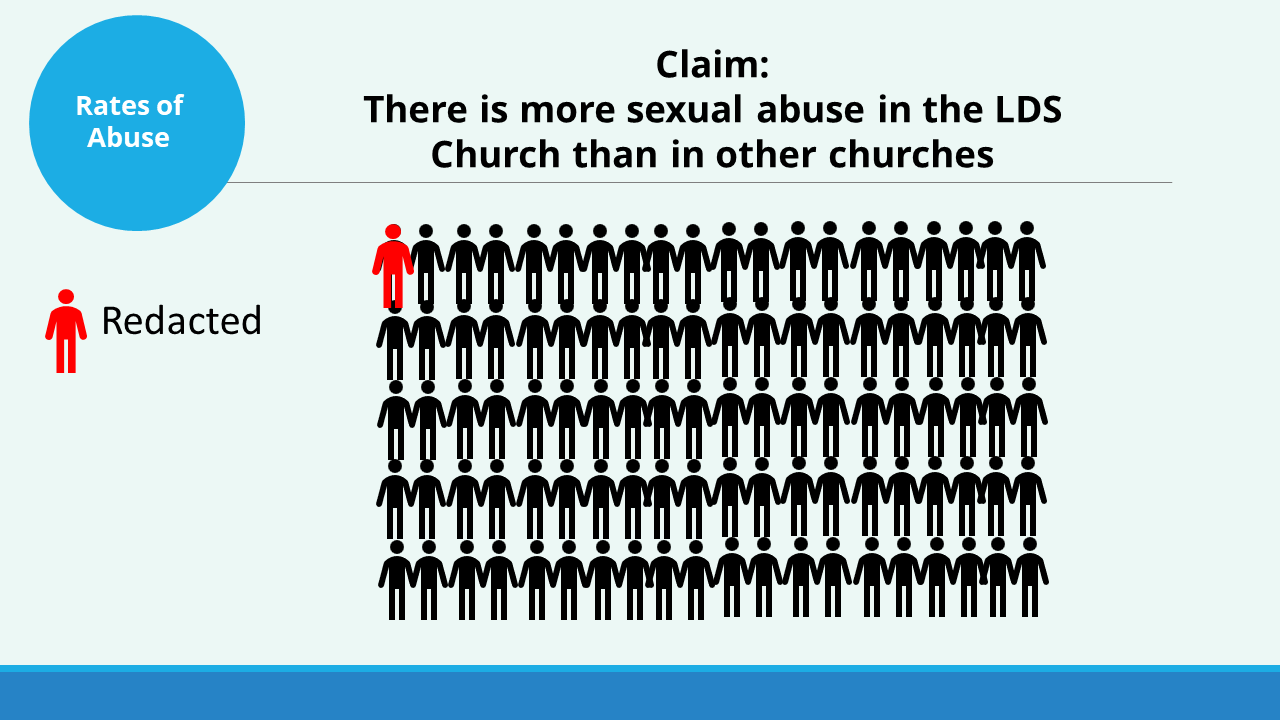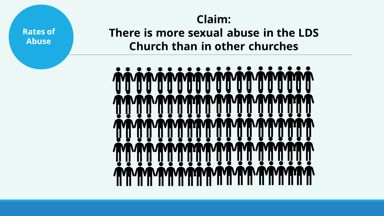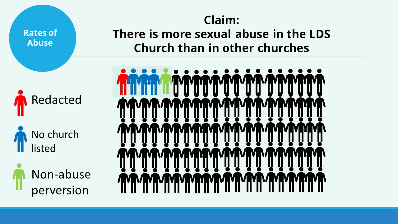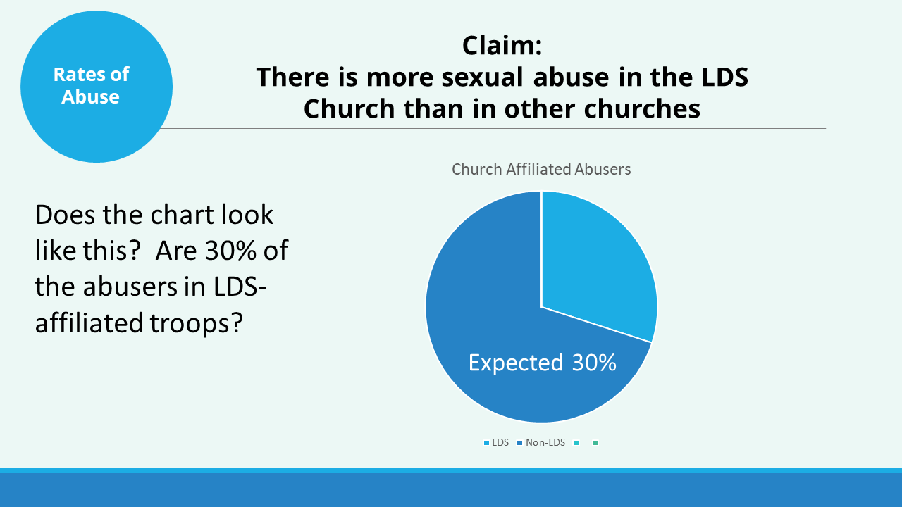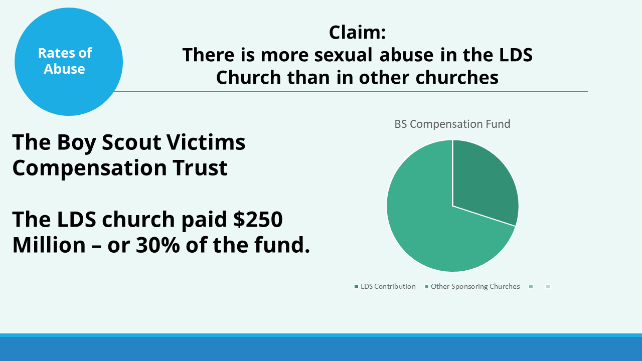 The claim is that there has been more sexual abuse in the LDS church than in other churches. The evidence says there’s actually statistically, provably less abuse — at least in this dataset, At least when we’re looking at these numbers. I don’t know how to get access to other numbers to look at them. If you do, please tell me — but the one dataset that we have access to, it’s significantly less.