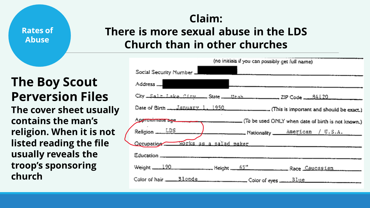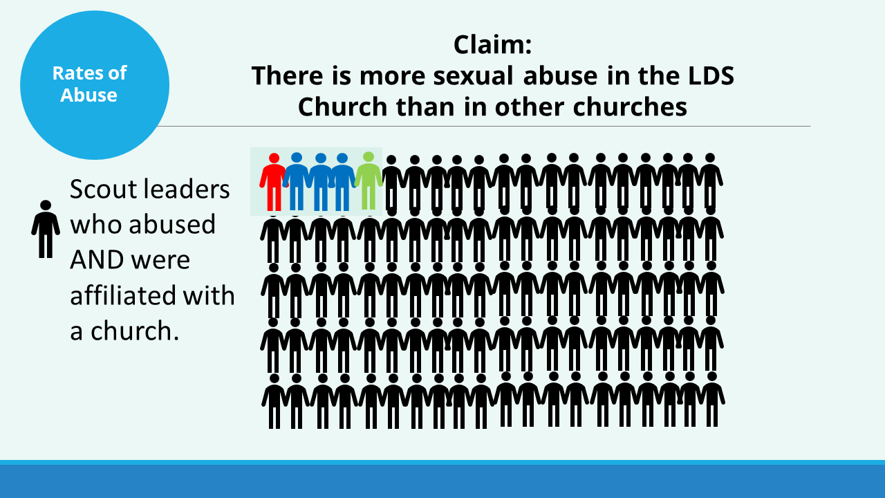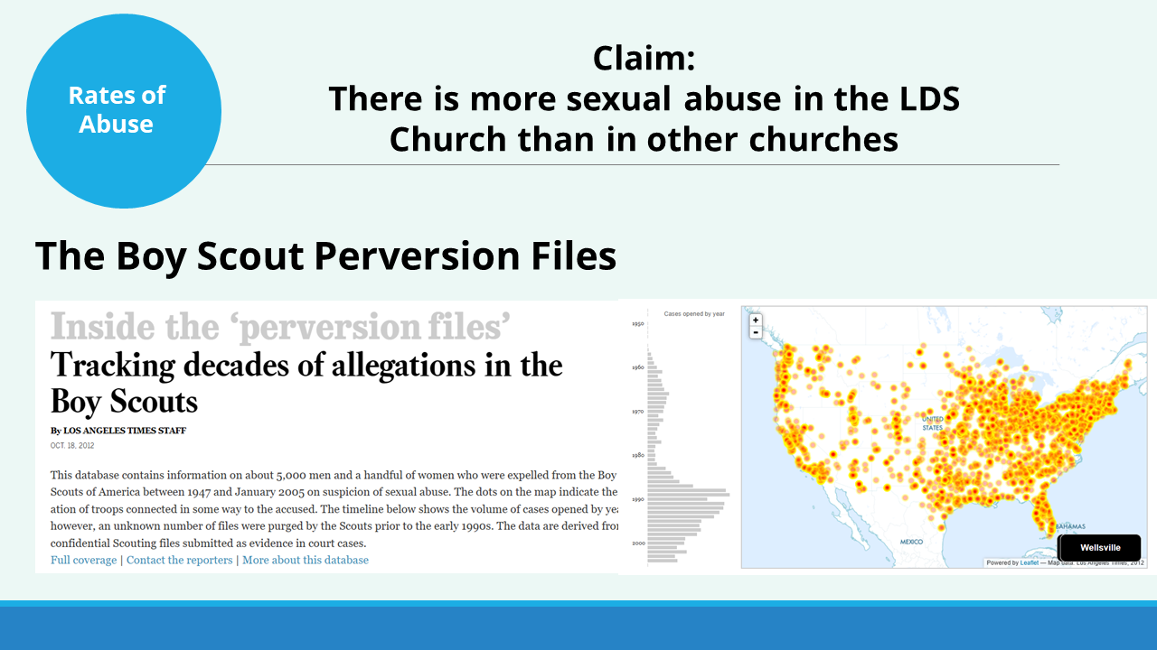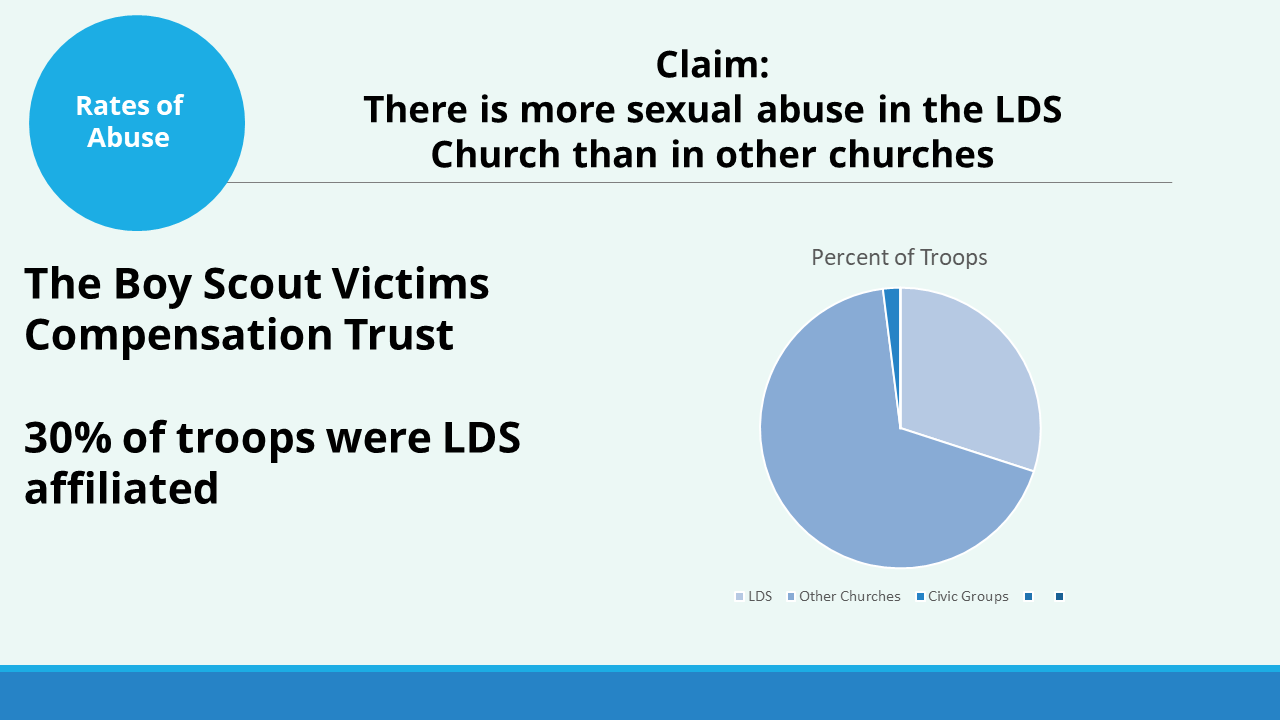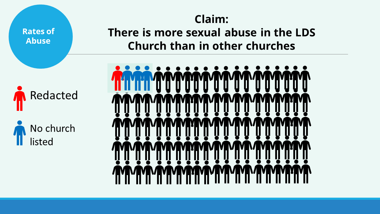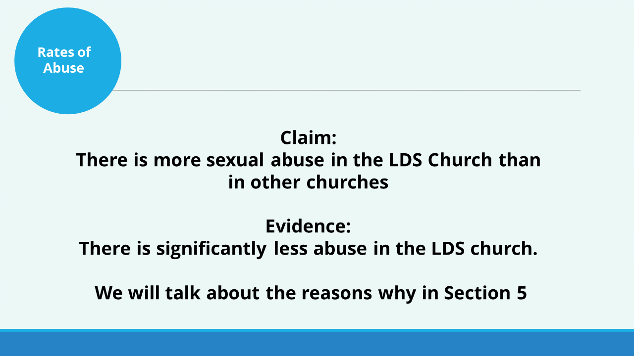 The claim is that there has been more sexual abuse in the LDS church than in other churches. The evidence says there’s actually statistically, provably less abuse — at least in this dataset, At least when we’re looking at these numbers. I don’t know how to get access to other numbers to look at them. If you do, please tell me — but the one dataset that we have access to, it’s significantly less.