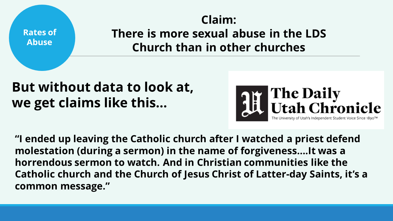 So, without data, here’s what happens. This is a quote from The Daily Utah Chronicle. It’s the independent student paper at the University of Utah. This is one of the more mild quotes — if you have read about this topic at all, you’ve probably heard quite a bit worse ones. An author says, “I ended up leaving the Catholic church after I watched a priest defend molestation during a sermon, in the name of forgiveness. It was a horrendous sermon to watch. And in Christian communities like the Catholic Church and the Church of Jesus Christ of Latter-Day Saints, it’s a common message.”