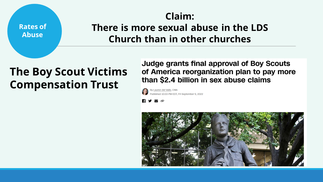 So, the Boy Scouts Victim Compensation Trust: the church paid $250 million into this fund, or 30% of the fund. The question that rises in my mind is: “Huh. How did they come up with that number? How did they come up with that percent? Why 30%?” I mean, it’s an interesting question, right? And you can find claims online where people will say — this is a quote — “They’re getting off for pennies on the dollar. Surely the church is responsible for more than 30% of the abuse that’s happened in the Boy Scouts!” But is that true? Well, is our Church responsible for 30% of the abuse that happened? So, what can we actually know?